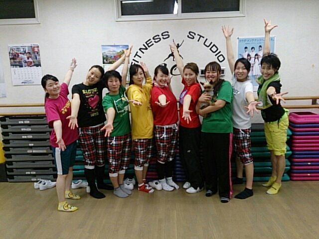 函館短期大学エアロビックダンス部の卒業レッスン スタジオで一時間プログラムを体験 湿度を上げてくれて 乾燥から脱出 一番の汗だくは私(笑) 部員のために休みを返上し気合いのレッスンを なんちゃって昭和♪ プレゼント レッスン後の写真に またも蔵之介登場 部長にだっこ 保育学科の学生部員が多かった今年の2年生 卒業試験もファイト