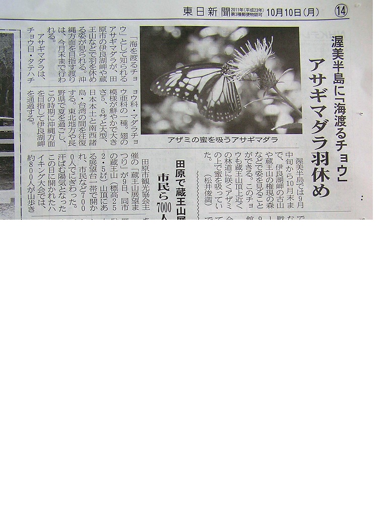 本日の東日新聞にアサギマダラの記事が載っていました。 ↓ へぇ~ もう来たんだと思っていたところに アサギマラダが飛んで来たから家に見においでよとお誘いがあったので、午前中に写真を撮りました。 ↓ 今日は4頭と少なめでした。 昨年来たアサギマダラ ↓ http://plaza.rakuten.co.jp/sugihana/diary/201010200000/