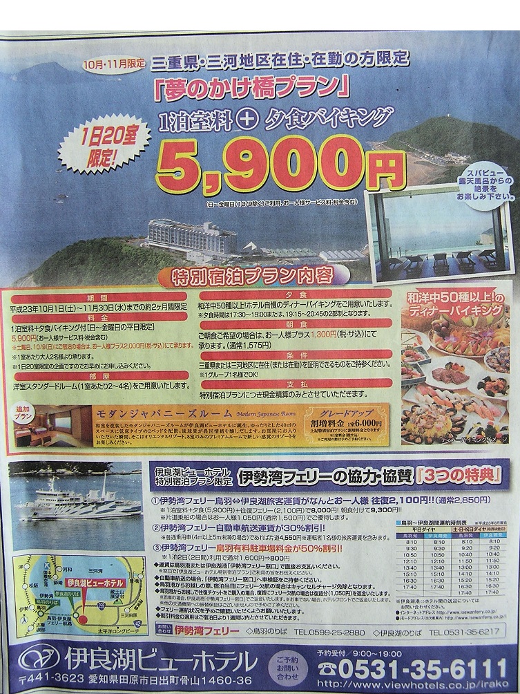 10月1日付けの中日新聞の広告欄に伊良湖ビューホテルのお得な宿泊プランが載っていました。 これはお得じゃん!で、即決。 家から車で1時間程度のホテルに3名の友人を誘って、のんびりしてきました。 食べることとお喋りに夢中で、写真を撮るのを忘れていました。 窓からの風景