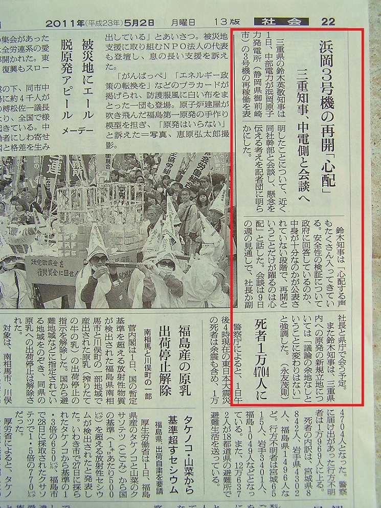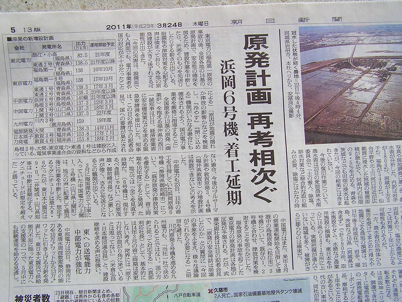 FNNニュース 05/07 07:29 http://www.fnn-news.com/news/headlines/articles/CONN00198917.html浜岡原発停止要請 海江田経産相、中部電力管内で計画停電は行われないとの見通し示す海江田経済産業相は、浜岡原発のすべての原子炉の運転を停止した場合でも、中部電力の管内で計画停電は行われないとの見通しを示した。6日夜、海江田経産相は「計画停電などの事態には至らないと思っております」と述べた。経済産業省によると、中部電力は、2011年度の管内の電力供給力を3,089万kWと計画、最大需要の見通しは、2,709万kWとしていて、差し引きおよそ380万kWの余裕があるという。一方、浜岡原発の3つの原子炉の運転停止によって失われる供給力は、あわせておよそ350万kWにとどまる見通しで、計画停電が必要となるような大幅な供給不足には陥らないという。また、関西電力は、中部電力の電力供給力が不足した場合に、電力融通の支援要請があれば、最大限協力したいとしている。一方、浜岡原発の原子炉格納容器の設計者・後藤政志工学博士は、「浜岡(原発)は、一番地震が予想されていまして、前から耐震上の問題、設計上の問題も心配になっていたというのが現実です。もともとの設計が、想定した地震が小さかったわけです。浜岡(原発)を最初にとりあえず止めるというのは、非常に妥当だというふうにわたしは思います」と述べた。
