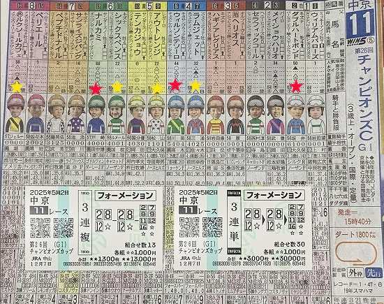 秋競馬は例年より少ない参戦だった… 今週から地元中山開催がスタート 28日に中央競馬締めとなる有馬記念までの四週間 秋晴れの中、久しぶりに午前中に出掛けた。 参道手前の銀杏並木も色付き、冬の近さを感じた。 本日のお目当ては…少し苦手としているダートG1レース JRA中京メインのチャンピオンズCの前売り買い 狙いは三頭で内側から四歳馬にして 未だ七戦しかしてない牝馬なのに六勝の02番 (ダートG1では牝馬は勝てないと言うジンクス) 次は当レース連続2着している実力馬の8番 そして現在四連勝中の三歳上り馬12番 但し今回古馬の強力馬との初顔合わせ~ 紐では追い込み馬の07番、09番、11番、16番 トンボの狙い馬~ 例年このレースは先行馬が有利とも言わており 後方一気タイプの脚質馬は消して 先行力がある差し馬が軸となる。 先に上げた02、08、12番の三頭を軸に 2Gは同じこの三頭にして、 3Gに07、09、11、16番の四頭。 トンボの買い目~ 02番、08番、12番三頭軸で 2Gも同じこの三頭 3Gは07、09、11、16番の四頭の 三連単30点を買う 保険馬券として同じ目で三連複13点も抑える。 結果は・・・ ![]() 1着;02番(3番人気) 2着;08番(2番人気)鼻 3着;07番(7番人気)2 1/2 4着;03番(8番人気)頭 5着;09番(4番人気)2 1/2 = 02番→08番→07番 で確定 三連複 02=07=08 ¥8,700円(30番人気) 三連単 02→08→07 ¥36,790円(106番人気) 当初の逃げ馬とは違う01番と11番の競り逃げで始まり 先行馬群がごった返す予想外の展開~ 四角から直線に入ると02番が早めに抜け出し 後続馬群より03番が追い込み、 インより08番強烈な脚で差したが G前では02番が差し返し鼻差で優勝! 3着は中団より07番がG前で03番を捉える。 断然人気12番が直線で馬群に沈み13着 もう一頭の16番も15着と三歳馬は大敗。 ダート競馬では場数踏んでる古馬陣が強い。 =観戦後記=