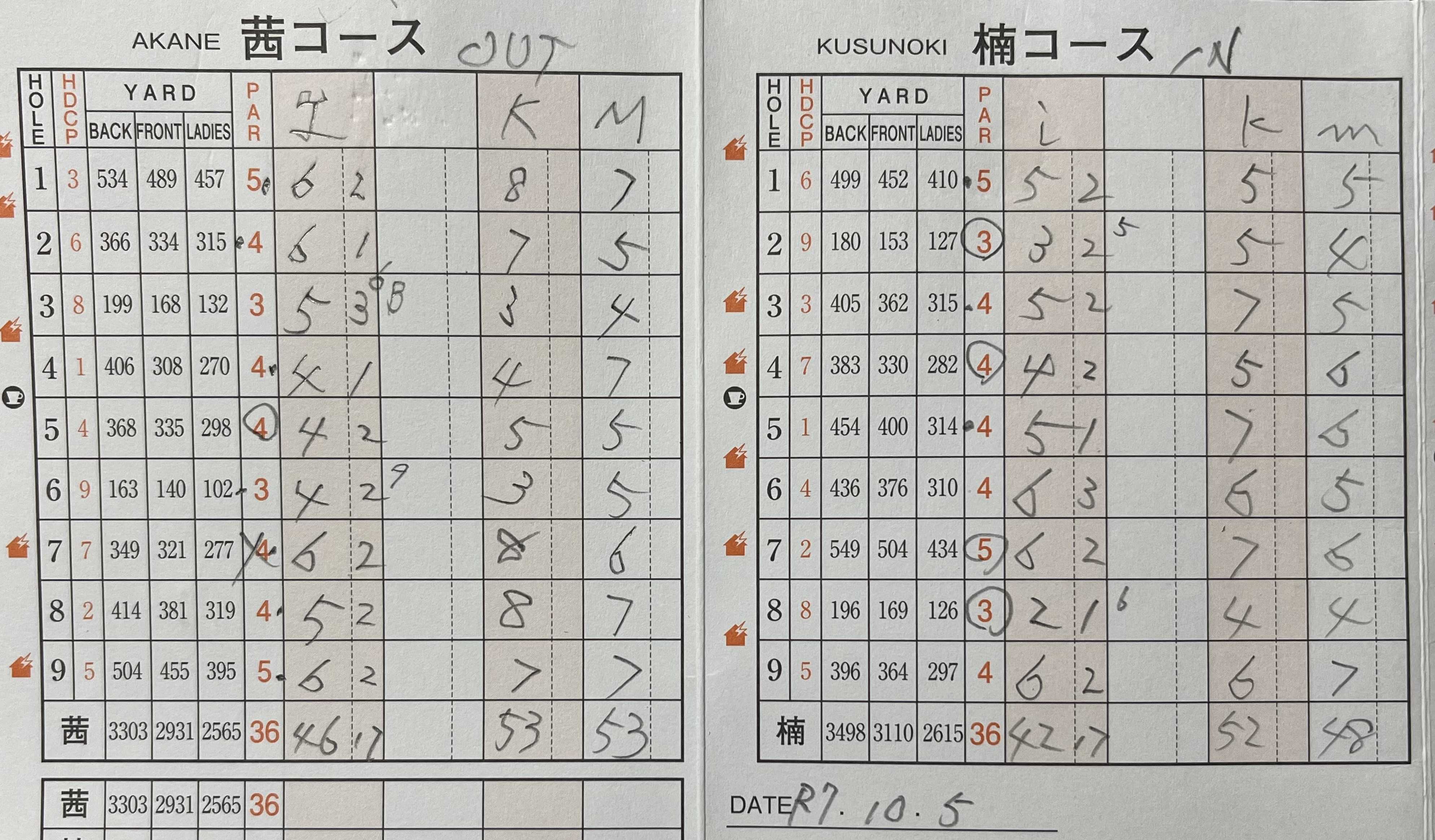 今日は地区の運動会やからゴルフする予定じゃなかったけど、先月先輩から誘われて迷うことなくゴルフを選択。 自治会役員の皆さま、ごめんなさいw 太閤山CCは半年ぶり。前回ラウンドの業界コンペ秋の陣が今月末にあるんで、その練習ラウンドの位置付け。 昨日の竜王GCはカッパ着てましたが、今日は小雨が降ったり止んだりで傘で凌げる程度。 寝不足気味な程度で、疲れた感は無し。 が、スイングはお疲れ感が出てました。 昨日の竜王GCで頻発したシャンクが心配やったけど、今日はシャンクなし。全然寄りませんでしたが…。 楠8番ショート ![]() 6鉄でピン手前4mにオン、ほぼストレートの上りラインを決めてバーディー♫ ◆太閤山カントリークラブ 茜→楠 白ティー 前半:+10(17) OB1発、3パット1回 後半:6(17) OBなし、3パット1回 ![]() パーオン率27%、ボギーオン率77%、FWキープ率28% なんとか90切り。 今日もドラ&FWはマトモに当たらず。 昨日の高麗グリーンがゲキ重やったせいで、太閤山のグリーンの早さに対応できず。1stパット大オーバー頻発。 後半やっとグリーンスピードに慣れてきて、ナイスタッチも筋違い…。 こんな不甲斐ない内容で、月末の業界コンペに向けてイイ練習になったのやら。 お気に入りの記事を「いいね!」で応援しよう