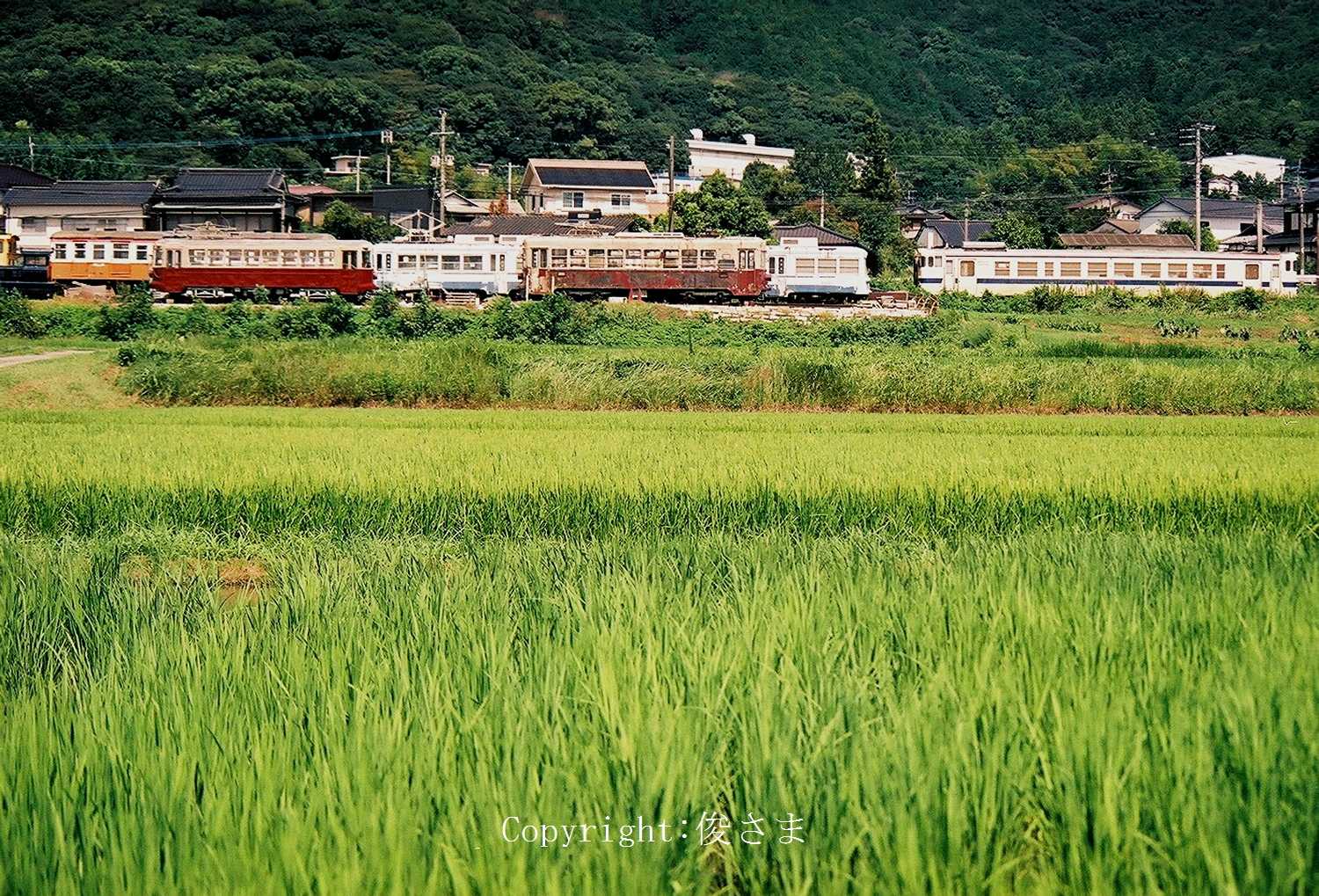その前に、甘木鉄道&西鉄甘木線へ。 ![]() 甘木鉄道・西鉄甘木線の「両」甘木駅は離れているのですが、甘木駅近くで両線が接近する箇所があります。ここで2つの列車を同時に撮れないかと。 西鉄が来れば甘木鉄道は来ない ![]() で・・・ ![]() 甘木鉄道が来ると西鉄は来ない・・・という結果でした。 ![]() 架線のない線路、空を入れて撮ります。 ![]() 国鉄風の色合いの列車も良いですね。 ここからはビッグアイの撮影です。 ![]() 撮影に選んだ場所ですが・・・現役の車両はどれ? ![]() 草むらのヒーローと化した西鉄の路面電車の群れ ![]() 路面電車の群れとビッグアイの組み合わせです。 ![]() こちらは冷水峠のお立ち台にて。 ビッグアイの撮影を終了し、ちょっと違う場所へ。 ![]() 炭鉱跡の風景 今から40年くらい昔、この場所に来ておりました。ここは昔、上山田線という路線が走っていた場所でして、この辺りで筑豊富士(飯塚のボタ山)を背景に列車を撮りました。 ![]() この近くにあるのがカエル寺(正法寺)小郡市にも同じくカエル寺がありますが、小郡市の方のご住職の息子さんがこちらのご住職とのことです。 ![]() 帰り道、締めは香椎線にて。 志免のボタ山を背景にハイブリッド列車を撮影します。 今、後ろの山がボタ山である事を知らない人も多いのでしょうし、「ボタ山」自体を知らない人も多いのでしょうね。 ![]() ちなみに同じ場所で撮った随分昔の写真 ボタ山に木なんてほとんど生えないと言われてましたからねぇ、鋭角だった山もだんだんと低くなだらかに変形していることが判ります。 ちなみに ![]() 香椎線とボタ山を隔てて反対側には勝田線という路線もありました。 背景の山は同じボタ山ですね。 勝田線は廃止となり景色も随分と変わってしまいました。この路線・・・残しておけば今頃それなりの収益になったと推測されます。嗚呼勿体ない。 お気に入りの記事を「いいね!」で応援しよう