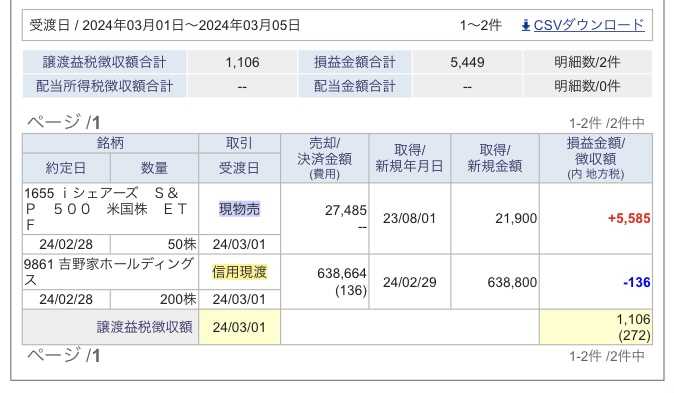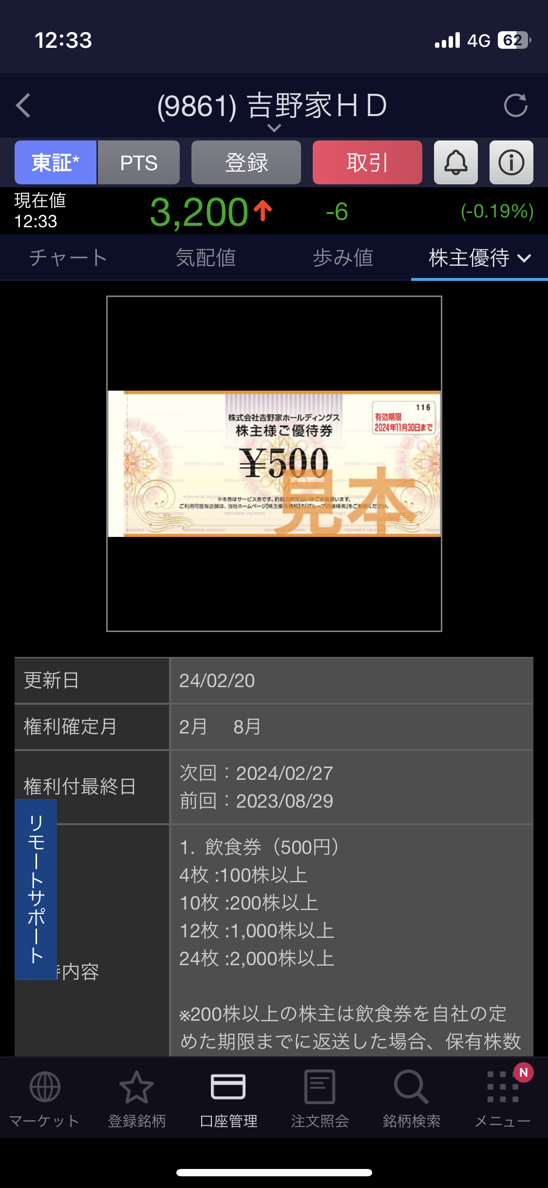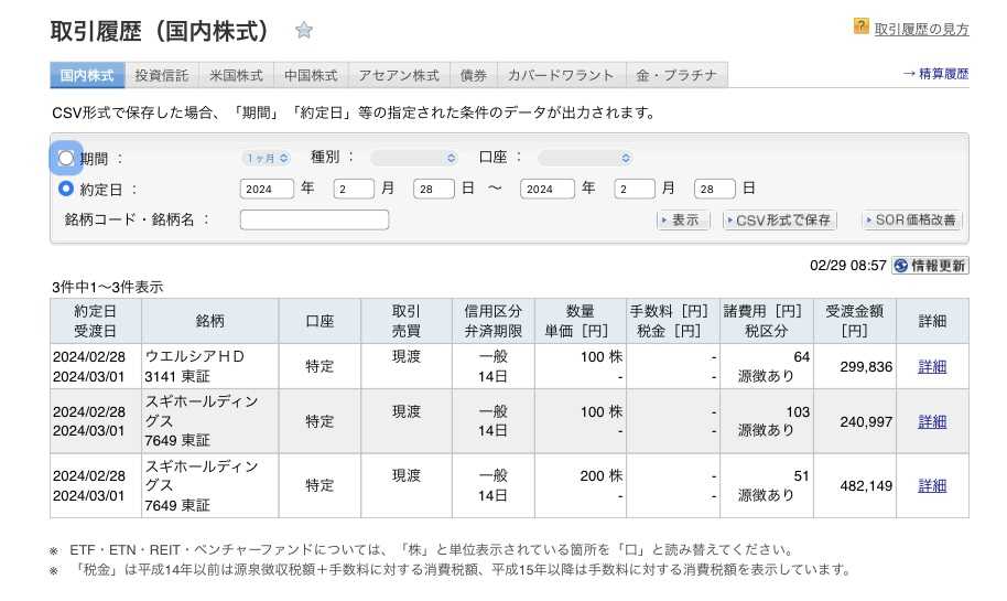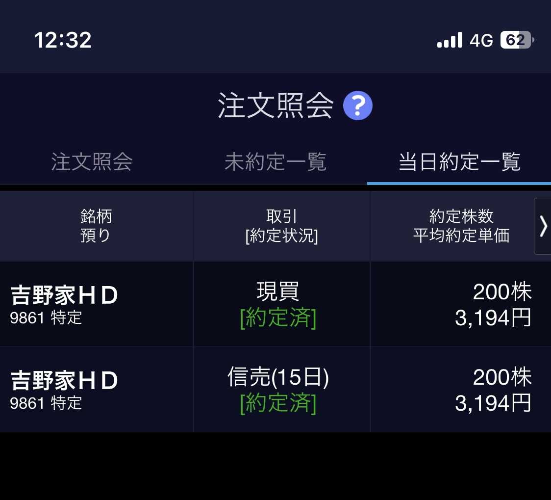 残っている中からクロス取引を仕掛けるハイエナ戦法で 費用を抑えて優待ゲット(*^ω^*) 忘れた頃に届くの楽しみ〜!!! 2024年2月は3銘柄(о´∀`о) 楽天証券でウエルシアとスギホールディングス! ![]() SBI証券で吉野家ホールディングス! ![]() 吉野家は 100株以上で2,000円分 200株以上で5,000円分のお食事券がもらえます! ほとんどの優待が2倍買っても倍もらえないのに 2倍買ったら2.5倍貰えるなんて、素晴らしい! ![]() 前日から見張ってて、最終日のお昼に在庫復活! 後場の寄成で200株ゲット!!! ![]() そして、忘れず現渡をして 諸経費は… ウエルシア、¥64 スギホールディングス、¥154 スギHDは分割されたので 「そんな株数買ったっけ?」と ビックリしちゃいましたwww ![]() 吉野家ホールディングス、¥136 ¥136で¥5,000分のお食事券?! 錬金術師になった気分(º ロ º๑) ![]() ----- ¥5,000といったら 牛丼10杯分くらい!!! 吉野家 牛丼の具 1袋(120g)×10袋 入院のお金の話をこちらでしています! 2021年の医療費(入院あり)はこちらこちら 2022年の医療費はこちら 2023年の医療費はこちら お気に入りの記事を「いいね!」で応援しよう