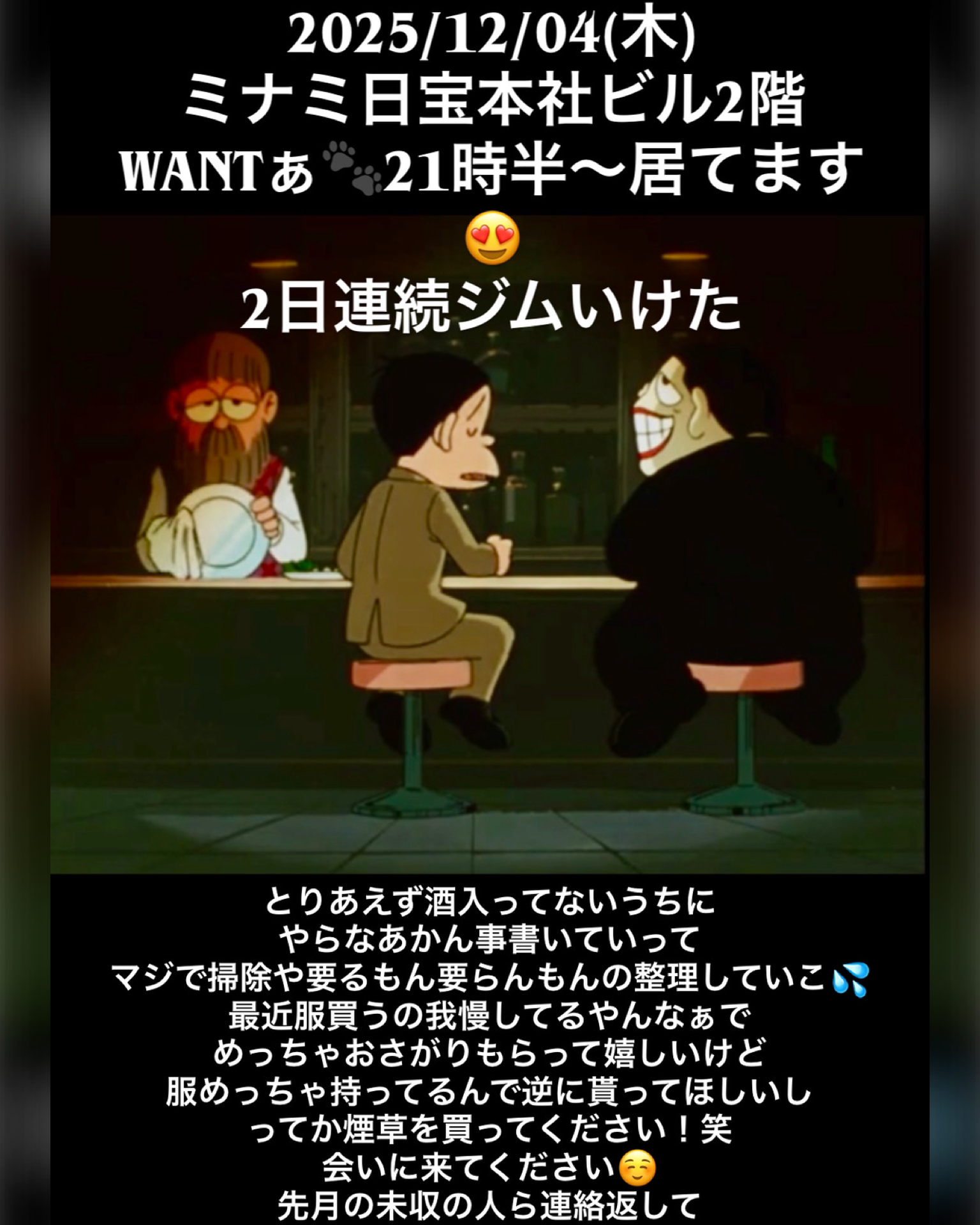(⚫️)′ `・){2025/12/04(木) 「どんなにまばゆく壮大な自然も、人間の悲劇の舞台に過ぎない」 ジョン・モーリー 脳や精神や腹の話は置いといて笑、 ここ最近結構飲んでても体の調子良い💗 大雪の日生まれなので寒い方が得意❄️ 今夜もよろちく 5日(金)はSparkleでぶりっ子💪 【wantぁ12年と5ヶ月 後悔無い様に会いたい人に会お🍻】 #大阪ミナミ 🐾【 #wantぁ 】🐾 #基本年中無休20時から8時くらい #日宝本社ビル 2階🏢 #堂山 #ニューハーフ #パンセク ✨ミックスバー【Sparkle】✨ 主に(金)20時〜☀️👶🍻 🐼 #必ず電話📲 #たぁぽん酢 #ミックスバー wantぁ #ミナミの住人と繋がりたい #派手髪 #冬生まれ #経営者とつながりたい #アーバンギャルド好きさんと繋がりたい #LGBT #ftm #中性 #ゲイバー #ビアンバー #おなべバー #パートナー募集 笑 #アルコールアスリート #バイセクシャル #飲み飲ませ #ボトルキープあり #遅くまで飲めます #看板消えてても中に居てたりします #電子マネークレカPayPayいけます #ずんだもん 👶🍺💨💨😎🔪💨 差し入れは煙草で 整形費手術費店の改装費カンパして笑 ビール酎ハイ焼酎シャンパン飲みたい ![]() ![]() ![]()