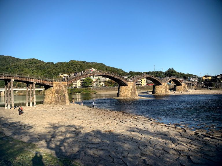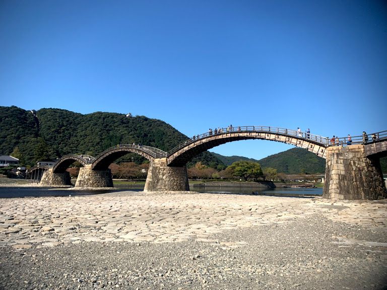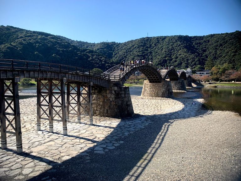 錦川に架橋された、5連のアーチを持つ木造橋。最初に創建されたのは1673年で、葛飾北斎や歌川広重が描いた浮世絵にも登場している。