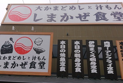 定食ランチ先日のランチです。「しまかぜ食堂」に入りました。ほぼ満席だったのですが、隣が空いたすきに店内を。この日は休日だったので、ランチメニューはやってなく、グランドメニューから。メニューはこちら。おすすめメニュー。私は鶏の唐揚げ定食、お父さんは鶏の黒酢あんかけ定食を。ここはご飯のお供食べ放題。待っている間に取りに行きました。この日のご飯のお供は、生卵、とろろ、ニラ醤油、梅干し、のり佃煮、キューちゃん漬け、しば漬け。ご飯も食べ放題。ふりかけも5種類ありました。ご飯のお供、これで2人分。私の鶏の唐揚げ定食。丼にたっぷりの豚汁付きです。お父さんの鶏のあんかけ定食。野菜がたっぷりで美味しそうです。こういうランチでした。ご飯をお代わりして、卵かけご飯で。卵かけご飯にニラ醤油を入れると美味しかったです。お腹一杯。お会計はこちら。ご飯とご飯のお供食べ放題でこのお値段はお値打ちですね。ここはまた利用したいです。