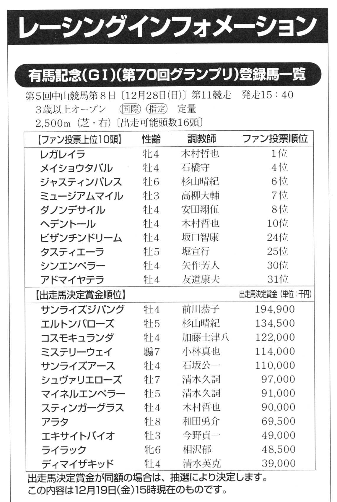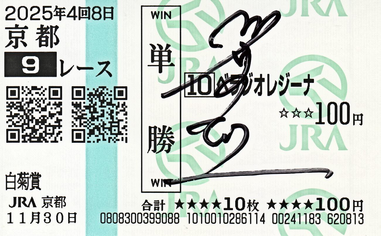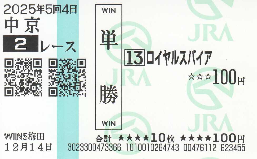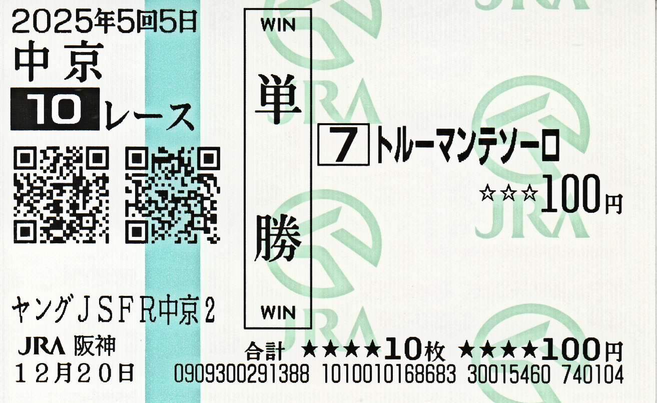 1日にJRAのG1レースが2戦あり、3日間連続G1も大変だ の 多摩の黒酢 です。2025年12月27日(土) 中山10R 中山大障害(JG1) 中山11R ホープフルS(G1)2025年12月28日(日) 中山11R 有馬記念(G1)グランプリ2025年12月29日(月) 大井9R 東京大賞典(G1)12/27のホープフルS(G1)の騎乗騎手を見ると、武豊騎手やC.ルメール騎手、C.デムーロ騎手などが全く騎乗していない。中山競馬場のホープフルS(G1)ではなく、阪神競馬場の阪神C(G2)へ騎乗している。 ホープフルS(G1) 1着賞金:7000万円 3.5万円/m 阪神C(G2) 1着賞金:6700万円 4.8万円/mと、阪神C(G2)の賞金は、G1レースと遜色がないくらい高額である。賞金額を距離で換算すると、阪神Cが芝1400mなのでコスパが断然良い。(翌日の有馬記念を考えると、落馬リスクの少ない古馬レースが無難と言う考え方もある。)ある意味、関西で最後のJRA重賞レースは、G1レベルなのである。ホープフルS(G1)ですが、7番人気のロブチェン(牡2)が2戦2勝(無敗)で勝ちました。【記念単勝馬券】12月27日のレープロですが、表紙の裏面がホープフルS(G1)で、裏紙の裏面が有馬記念(G1)でした。ある意味で豪華版ですね。。。レープロ(JRA阪神競馬場版):JRA-VANの分析もG1レースを2本立て2025年の1年を振り返るカラーページが中に入ってます。