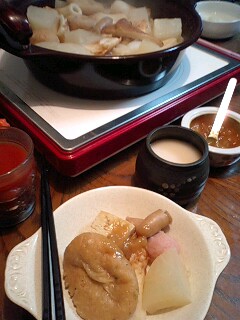 好きです タコはは 好きです タコはは好きです タコはは 好きです タコははいらっしゃいませー ようこそ 居酒屋タコはは へ ハイ 3名様 お席の方へご案内致しまーす。 それではお品書きのご案内をさせて頂きます。 「味噌おでん」 「甘酒」 「トマトジュース」をご用意致しました。今夜はこってりお味が染み込んだ味噌おでんで温まって頂きます。厚切りの大根、ちくわ、さつま揚げ、がんもどき、結びコン等お馴染の具材に、タコはは特製の干し豆腐もたっぷり入れて煮込みました。最近話題の生姜の砂糖漬けを細かく刻んで練り込んだ美味しい生姜味噌でたっぷりとお召し上がり下さい。干し豆腐はタコはは定番のザルで水切りした豆腐を一口サイズにカットして、干物用の干しカゴに並べマイナス10℃が続く厳寒の車庫に吊るして時々上下返しながら数日間干してカラッカラに乾燥させたものですが、煮物や薄切りして味噌汁等に入れると凝縮されたお豆腐の旨みが出てとっても美味いですよ今夜はがすすみますね好きです タコはは 好きです タコはは好きです タコはは 好きです タコはは