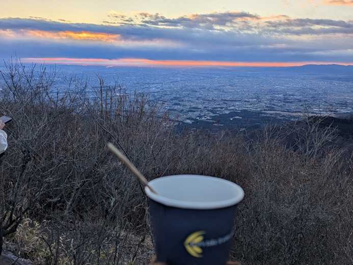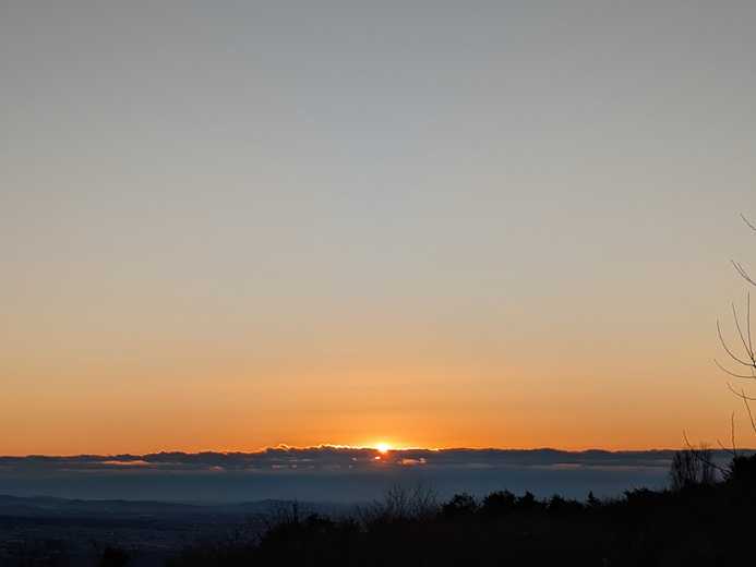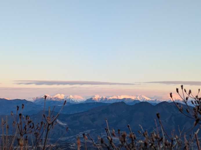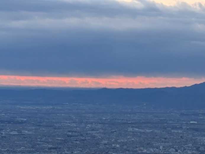 お正月はご来光三昧だった。 元旦。 登山はせず、麓からご来光を拝んだ。 娘たちが二人とも帰省していたが 次女は体調がイマイチと言うことで、主人と長女と三人で。 元旦は、東の空に低く雲が立ち込めていた。 日の出が近くなると、雲が光の帯で縁取られてきた。 すごく幻想的で、初めて見る光景だった。 ![]() 縁取りのどこかから、ピカーっと光が現れた。 ![]() そして、御来光 ![]() 夢中で写真を撮ったら、同じような写真がいっぱいになってしまった。 ![]() 平和で恵まれた一年になりますように 2日(金) 頂上でご来光を拝むべく、水沢山に登った。 ヘッデンの灯りで、5時頃登山開始。 田舎の街だけど夜景がずいぶん明るい。 ![]() 日の出に間に合って、山頂着。 南東方向がどんよりしている。 地平線と雲の間が朝焼けで赤く染まって そのせいか、いつもよりスカイツリーがくっきりと見えた。 ![]() 何と、横浜ランドマークタワーまで! 右側の稜線から左に向けてずっと下がって来た最後のピークの上あたりに ぼんやり棒みたいなのが見える。 あれがランドマークタワーだそうだ。 望遠レンズのカメラで撮った写真を見せてもらったことはあったけど 肉眼で見たのは初めてだった。 群馬の真ん中から横浜のビルが見えるとは、驚いた。 ![]() 西高東低の気圧配置が崩れて、上越国境の山々がきれいに見えた。 ![]() 偶然一緒になった山友さんから甘酒を頂いた。 温かくて美味しかった。 ![]() 富士山と、肝心な御来光は見られなかった。 東の空の雲が厚すぎて、陽が出た時には太陽はまばゆいばかりの光を放ち 御来光という感じではなかった。 しかし、東京、横浜、上越国境の絶景を眺めたので、気を良くして下山。 途中、干支のお地蔵様のところで足を止めた。 ![]() 今年の干支、午のお地蔵様にお参り。 ![]() 夜は、新年会をした。 元旦はニューイヤー駅伝の係員で忙しかった次女の夫君もやってきた。 長女がパンを焼き 次女がラザニアを作り 私はお雑煮など、その他色々を作った。 ![]() 4日(日) 今度こそ山頂からご来光を拝むべく、水沢登山。 少し登ると、東の空が赤く染まって来た。 今日は、雲が全くない。 ![]() 空がさらに赤く燃えて、その空を背景に筑波山の双耳峰がくっきりと見えた。 その美しさにはちょっと感動だった。 ![]() 山頂に着き、暫く待つと雲一つない地平線から御来光 ![]() 神々しい ![]() 今日は富士山もバッチリだった。 水沢山から、ちいさなちいさな富士山を眺めた。 ![]() 御来光と富士山を眺めて、西の空を見ると まん丸いお月様が白く光ってまだ顔を出していた。 ![]() 御来光や素敵な景色が見られた。 去年は少し悲しいことがあったので 今年は恵まれた、素晴らしい一年になりますように お気に入りの記事を「いいね!」で応援しよう