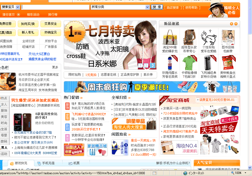![]() これが、淘宝網のトップページです。 なんか、ゴチャゴチャしてますよね。 中国語が分からない人には、さっぱりわからないかもしれません。 でも、中国人はこういうゴチャゴチャしている画面、結構好きなんです。 盛り上がっている感じするでしょ? 淘宝網は、簡単に言うと参加費無料のショッピングモールです。 基本的にダレでも参加でき、よほどのヤバい商品(拳銃とか麻薬とか政治的なもの)以外は何でも売り買いできます。 無料でダレでも参加できるってのがいいですよね。 リスクが非常に少なく、ひょっとしたら”大儲け!!”かもしれないのですから。 これが、ここ数年間で利用者がぐっと増えた原因です。 2008年6月現在、中国のネットショップの利用者のうち、約6割以上がこの”淘宝網”を利用しているという統計も出ています。 私は7年間も中国に住んでいますし、中国語も問題ないので、この淘宝網に参加出店するのには非常にいい環境ですよね。 なんで今まで気づかなかったんだろうな、って思います。 もちろん、売れるかどうか?なんてわかりませんけど、とにかく出店料が無料ですし、そんなに在庫を抱えないといけないようなモノをはじめから手掛けなければいいわけですから。 早速、登録して出店までこぎつけたいと思います! では!応援してくださいね! お気に入りの記事を「いいね!」で応援しよう
