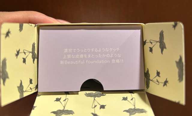 箱がまた美しくて…捨てられない。 正面から。 裏面の成分表示。 4色展開。 私は色白でも色黒でもない、赤味強めの肌なので 標準色というルンバチャチャチャにしました。 ネーミングがどれも楽しそうですw 上蓋をあけるとこんなメッセージ。 本体のファンデと厚みのあるスポンジが入っています。 箱の中身を取り出した図。 テクスチャーわりと固め。 だからリキッドファンデではなくファンデーションクリームなんですね。 キャップは筆状ではなく、ヘラになっています。 手の甲にちょんと載せてみました。 肌なじみのいい色です。 伸ばした後。 めっちゃナチュラル。 実際、先日のお出かけで使いました。 オイリー肌用のベースを使った後にこちらを使用。 クリームなんだけど、少量でも伸びはとてもいいです。 出がけは急いでいてしばらく鏡も見ておらず だいぶ経ってからトイレで顔を見ましたが 崩れてもおらず、白浮きもしておらず 自然だけどちょっと色白っぽく見えてすごくよかった! クリームファンデはこれから寒くなっていくとより使いやすそう。 秋冬、活躍させたいと思います。