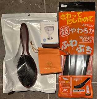 到着画。 オレンジの巾着が2個ついていました。おまけかな? 猪毛ヘアブラシ。 サイズはMにしましたが、レビュー通り大きい。 Sと迷ってMにしたのですが、Sでもよかったかな~ 猪毛を高密度に配置することで 天然オイル成分が髪全体に行きわたるそうです。 私は普段はブラシを使いません。手ぐし派です。 洗髪の時に使うくらいかな。 直毛なので絡まないので。。。ただ直毛ならではの悩みもあります。 私はこのブラシは頭皮ケア目的で使います。 とても気持ちがいいです! 次はフェイスクーラー。 ご丁寧にシリコンキャップがついてるんです。 意外と大きさがあります。 私は温熱で使うつもりはないので 冬はちょっと寒いので試しにそのままあててみましたが、ひんやり冷たいので 冷却して夏場に使うと本当に気持ちよさそう! お次はインソール。 ブラックの23.5~24.0にしました。 特にブーツは大きめのサイズを買うことが多いので。 私、白いポコポコの方が上だと思ってましたが、違いました(;'∀') こちらが上側です。 こちらが底側。 結構厚みがあります。 今回購入したショートブーツでちょうど大きいものがあったので こちらを入れました。 うん、クッション性しっかり、疲れにくく歩きやすい感じでよいです! 最後はロンシャン用ショルダーベルト。 1個肩に掛けられない持ち手のロンシャンがあって やっぱり肩掛けがデフォルトの私にとっては使いづらくて 出番が無かったんです。 見た目も違和感なし! これで荷物少ない時に活用したいと思います。