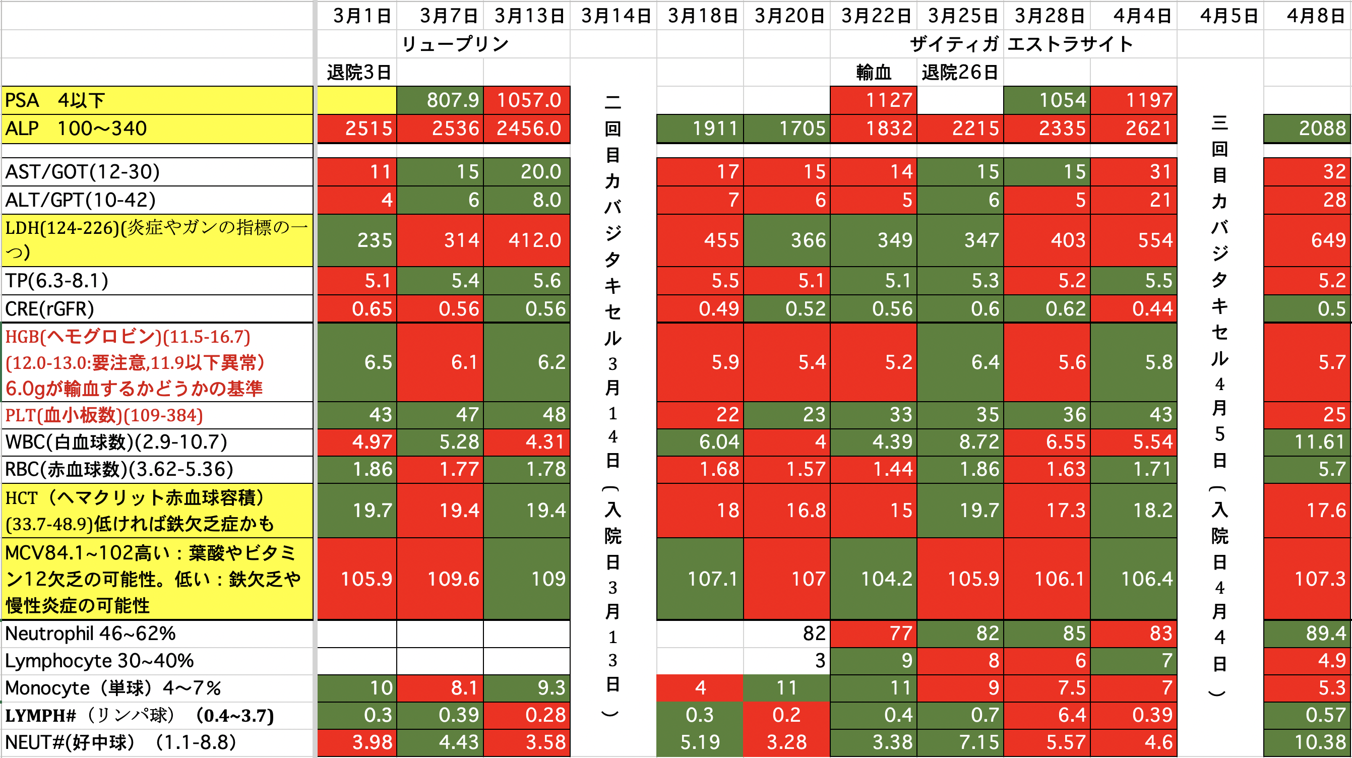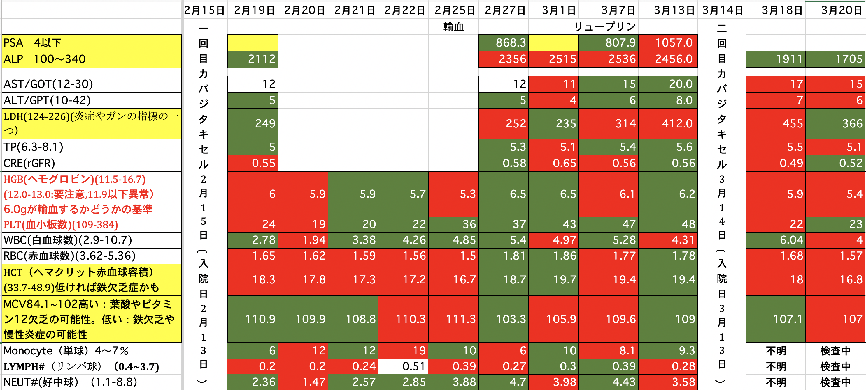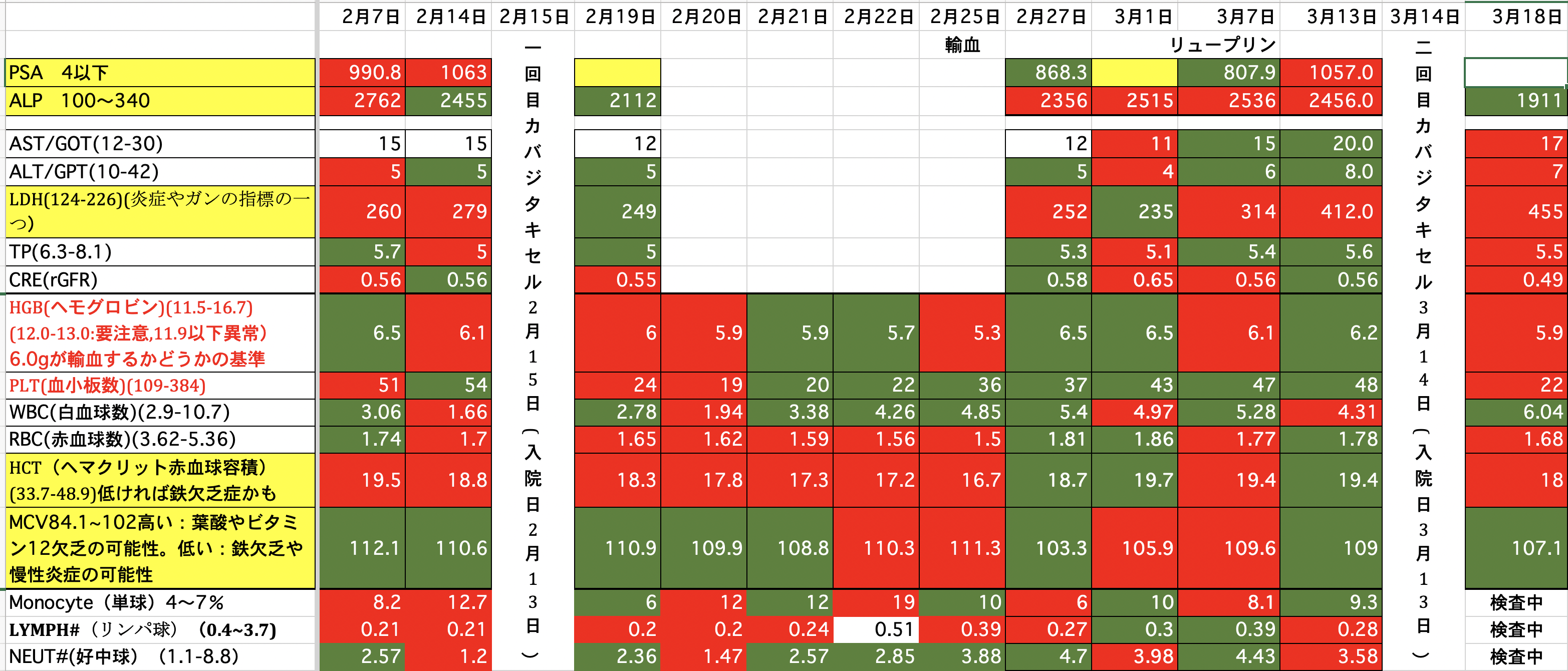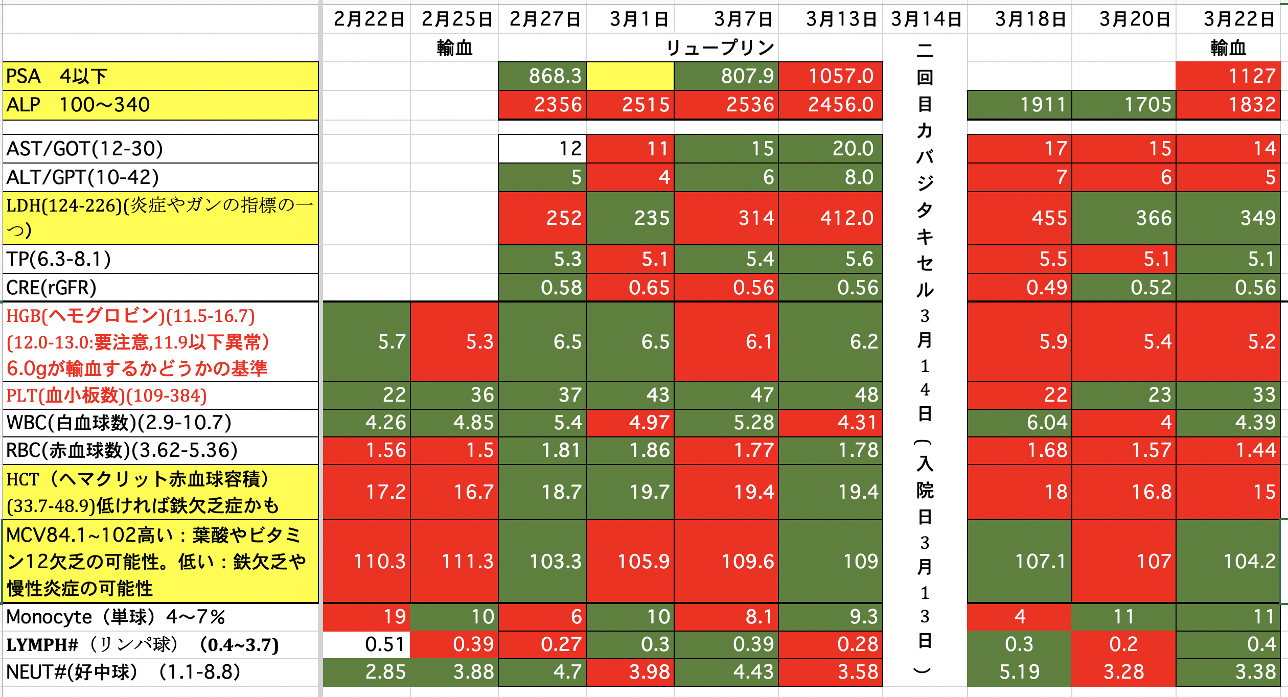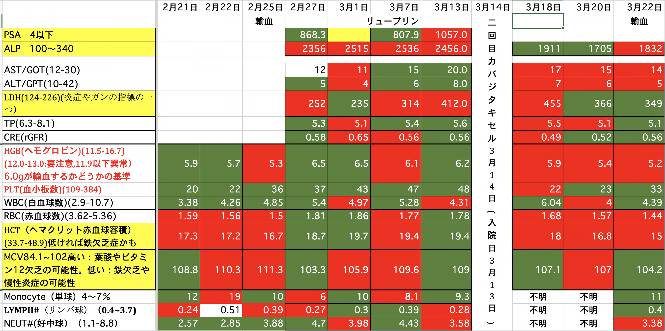 PSA:1500から1245に減りました。ALP:2271から2949に増えました。(放射線を当てたのでその分上がっているのではないか)LDH:690から576に減りました。昨夜、血尿が少し出ました。一回だけなので大したことないと思いますが。どうなんでしょうか。顎骨壊死の部分からも少し血が滲んでいるようです。現在、血小板数が少ないので数日中に血小板の輸血をするかも知れません。頭の皮膚が火傷の様な痛みが有りますが、放射線の影響か髪の毛が毎日少しずつ抜けてしまっています。今の髪の毛は放射線前の半分くらいになってしまった様です。前回、泌尿器科の先生と話し合いをした時にカバジタキセルは取り敢えず今回で終了と言われていましたが、正式に決まりました。また、カバジタキセルは再開の予定らしいですが、他の治療も今なら効果があるかも知れないです。色々やってみる価値があるかも知れません。最後まで読んでいただき、ありがとうございました。