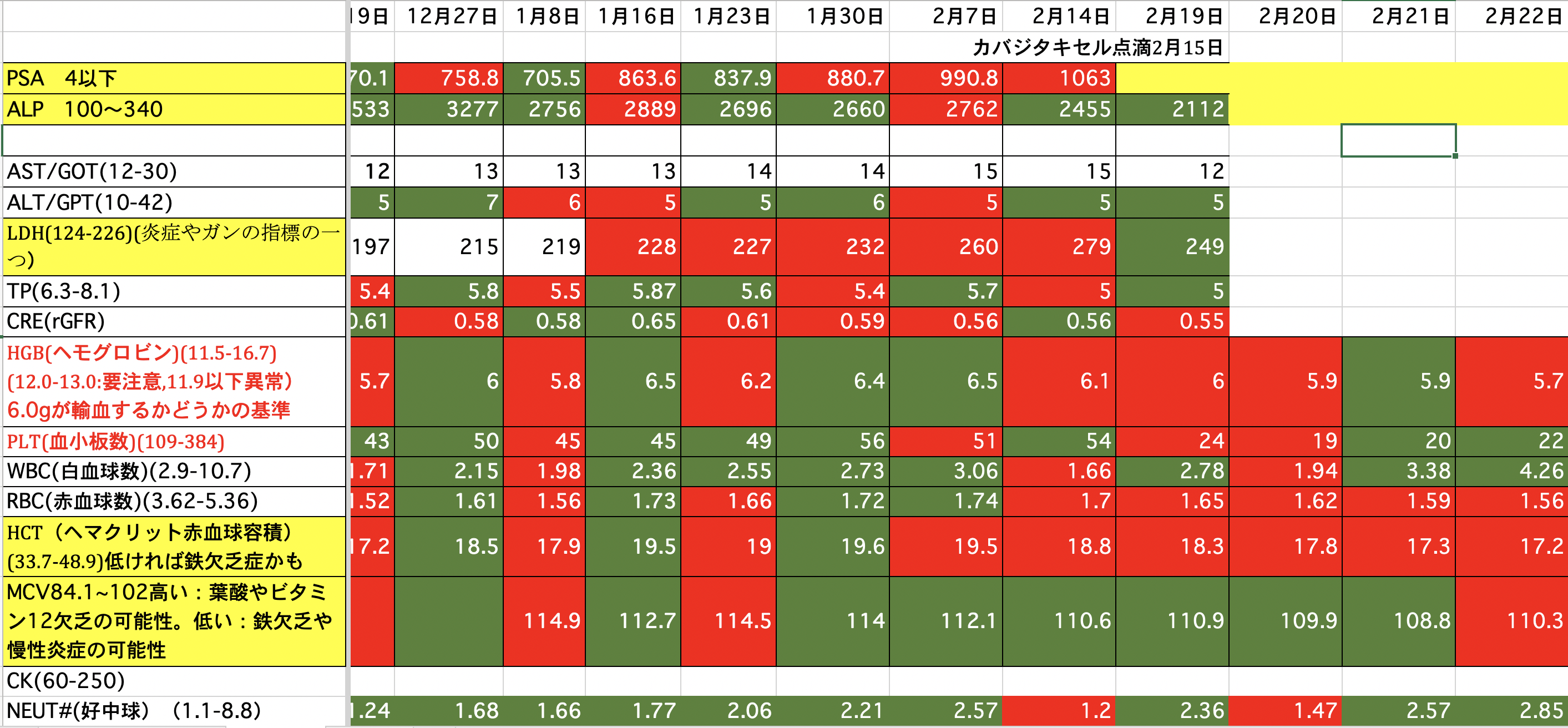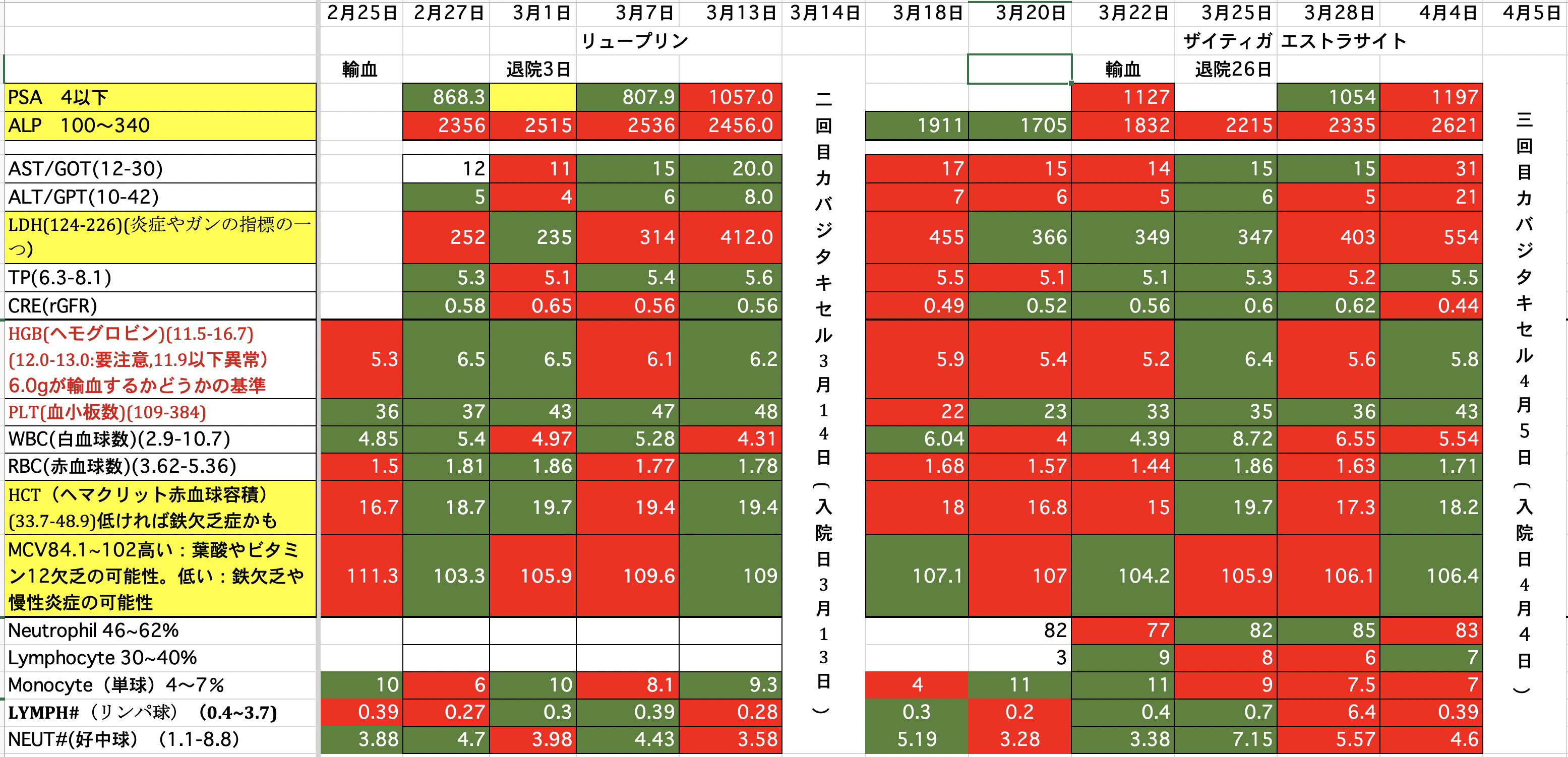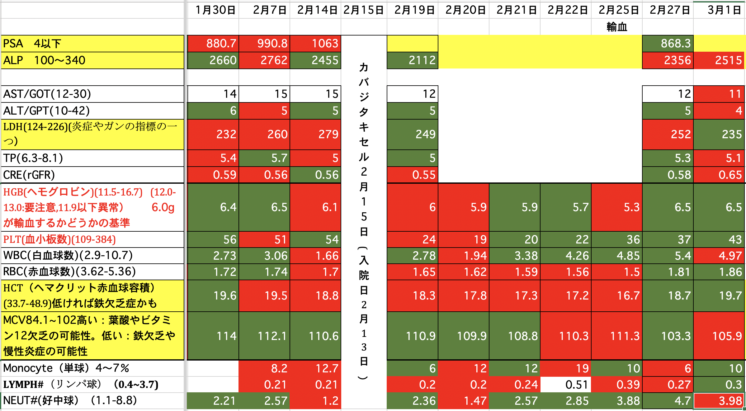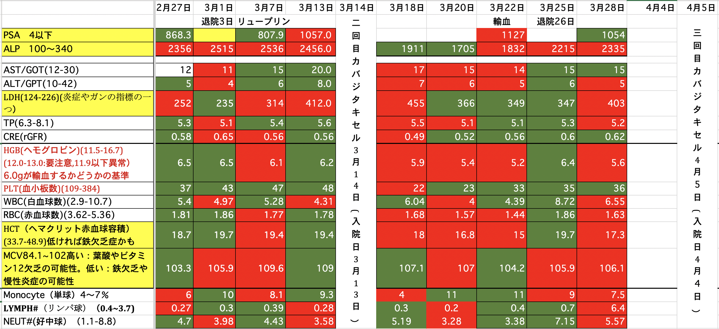 PSA:1500から1245に減りました。ALP:2271から2949に増えました。(放射線を当てたのでその分上がっているのではないか)LDH:690から576に減りました。昨夜、血尿が少し出ました。一回だけなので大したことないと思いますが。どうなんでしょうか。顎骨壊死の部分からも少し血が滲んでいるようです。現在、血小板数が少ないので数日中に血小板の輸血をするかも知れません。頭の皮膚が火傷の様な痛みが有りますが、放射線の影響か髪の毛が毎日少しずつ抜けてしまっています。今の髪の毛は放射線前の半分くらいになってしまった様です。前回、泌尿器科の先生と話し合いをした時にカバジタキセルは取り敢えず今回で終了と言われていましたが、正式に決まりました。また、カバジタキセルは再開の予定らしいですが、他の治療も今なら効果があるかも知れないです。色々やってみる価値があるかも知れません。最後まで読んでいただき、ありがとうございました。