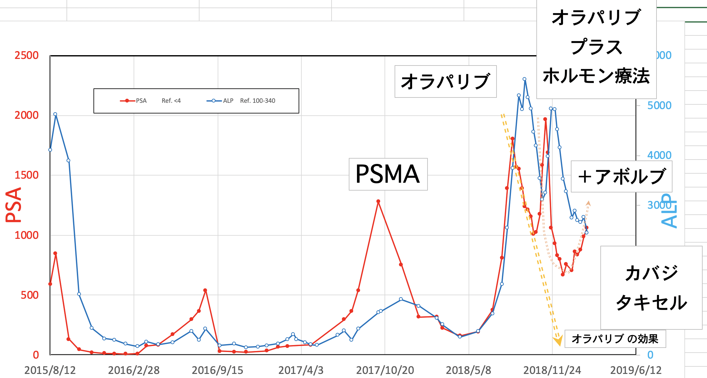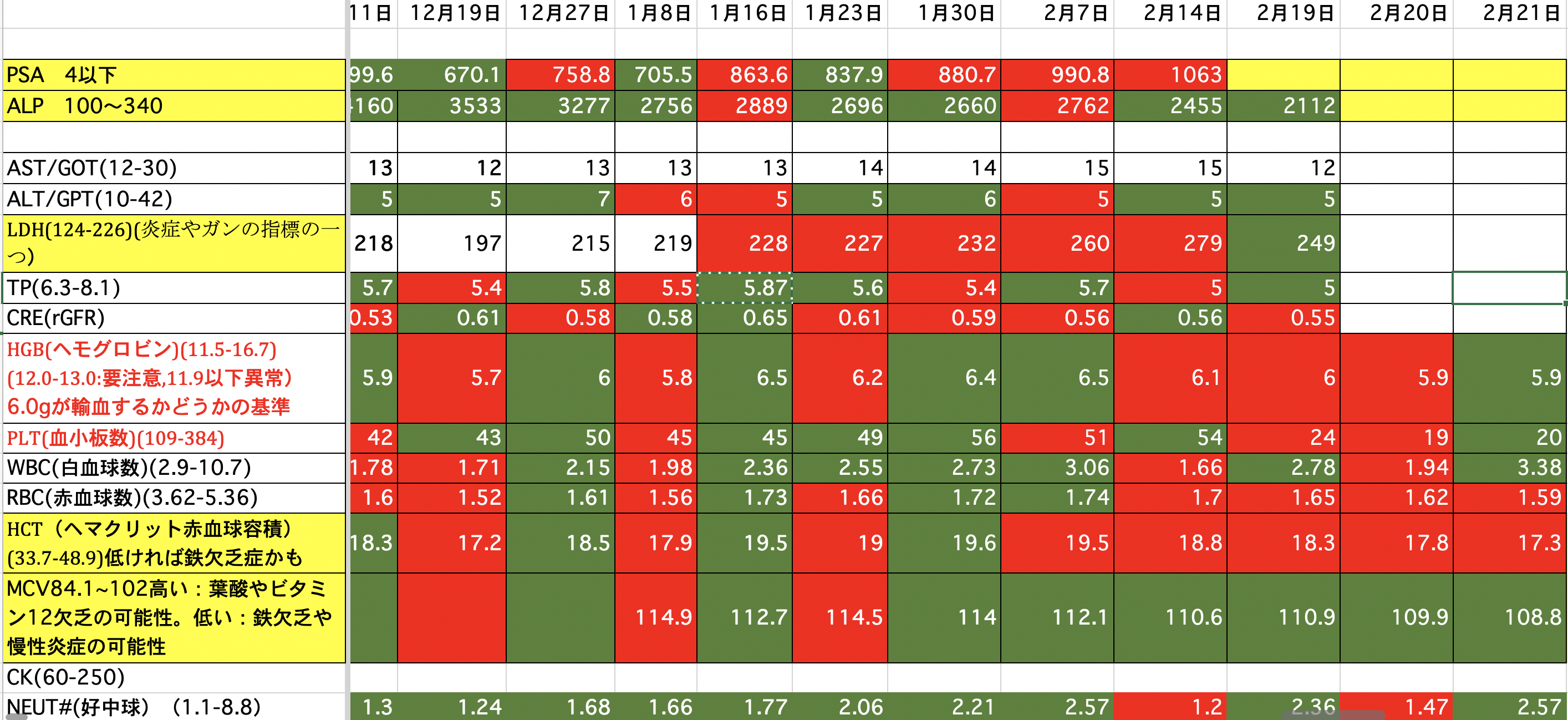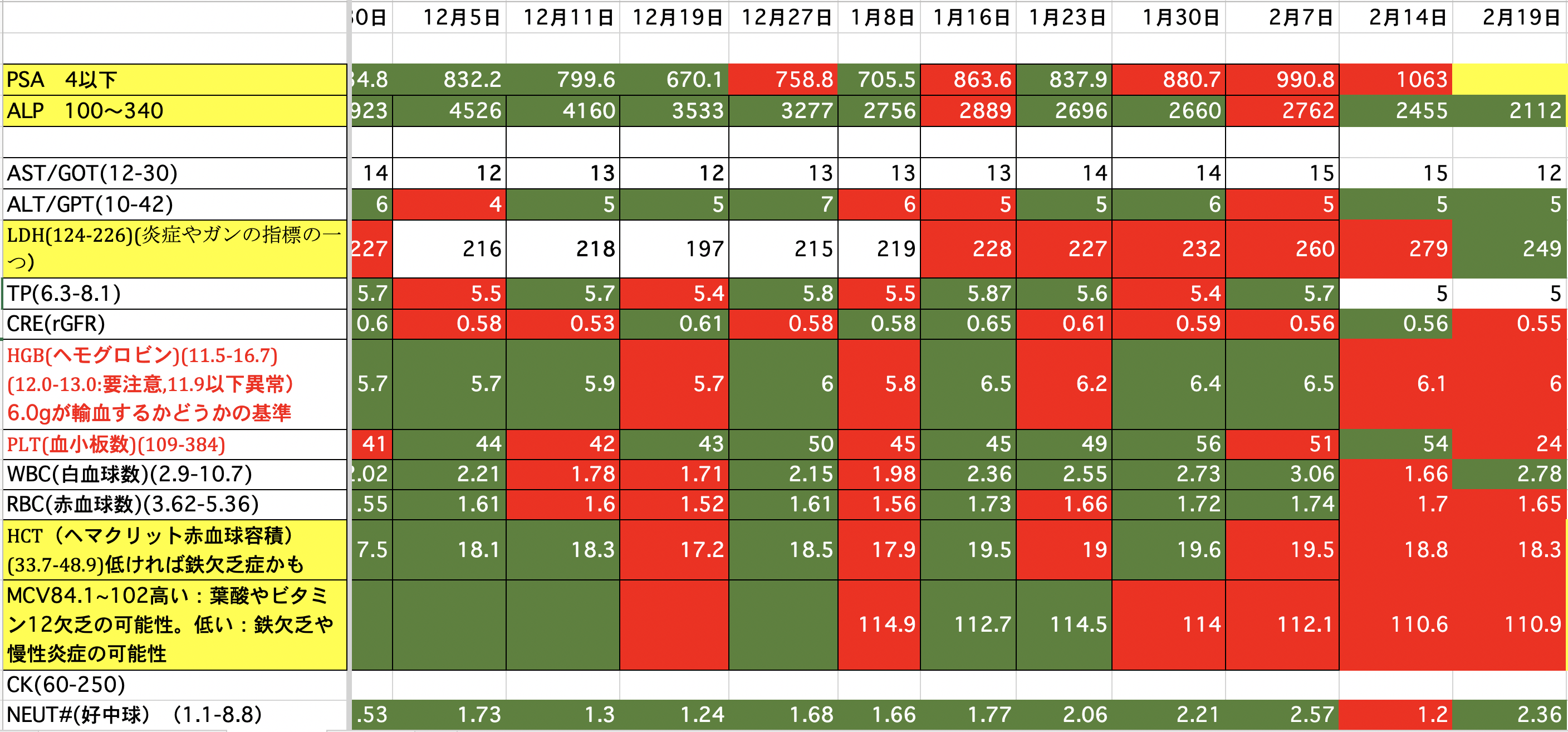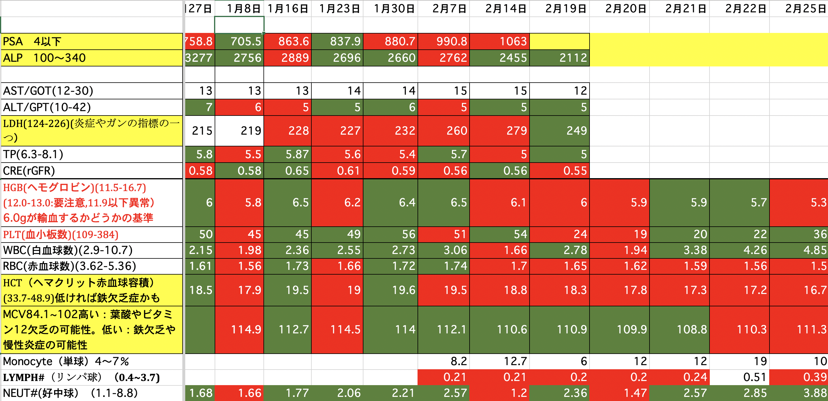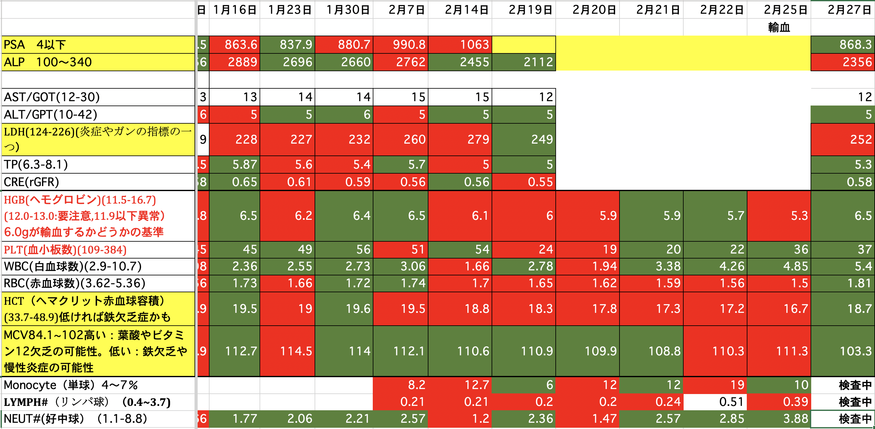 PSA:1500から1245に減りました。ALP:2271から2949に増えました。(放射線を当てたのでその分上がっているのではないか)LDH:690から576に減りました。昨夜、血尿が少し出ました。一回だけなので大したことないと思いますが。どうなんでしょうか。顎骨壊死の部分からも少し血が滲んでいるようです。現在、血小板数が少ないので数日中に血小板の輸血をするかも知れません。頭の皮膚が火傷の様な痛みが有りますが、放射線の影響か髪の毛が毎日少しずつ抜けてしまっています。今の髪の毛は放射線前の半分くらいになってしまった様です。前回、泌尿器科の先生と話し合いをした時にカバジタキセルは取り敢えず今回で終了と言われていましたが、正式に決まりました。また、カバジタキセルは再開の予定らしいですが、他の治療も今なら効果があるかも知れないです。色々やってみる価値があるかも知れません。最後まで読んでいただき、ありがとうございました。