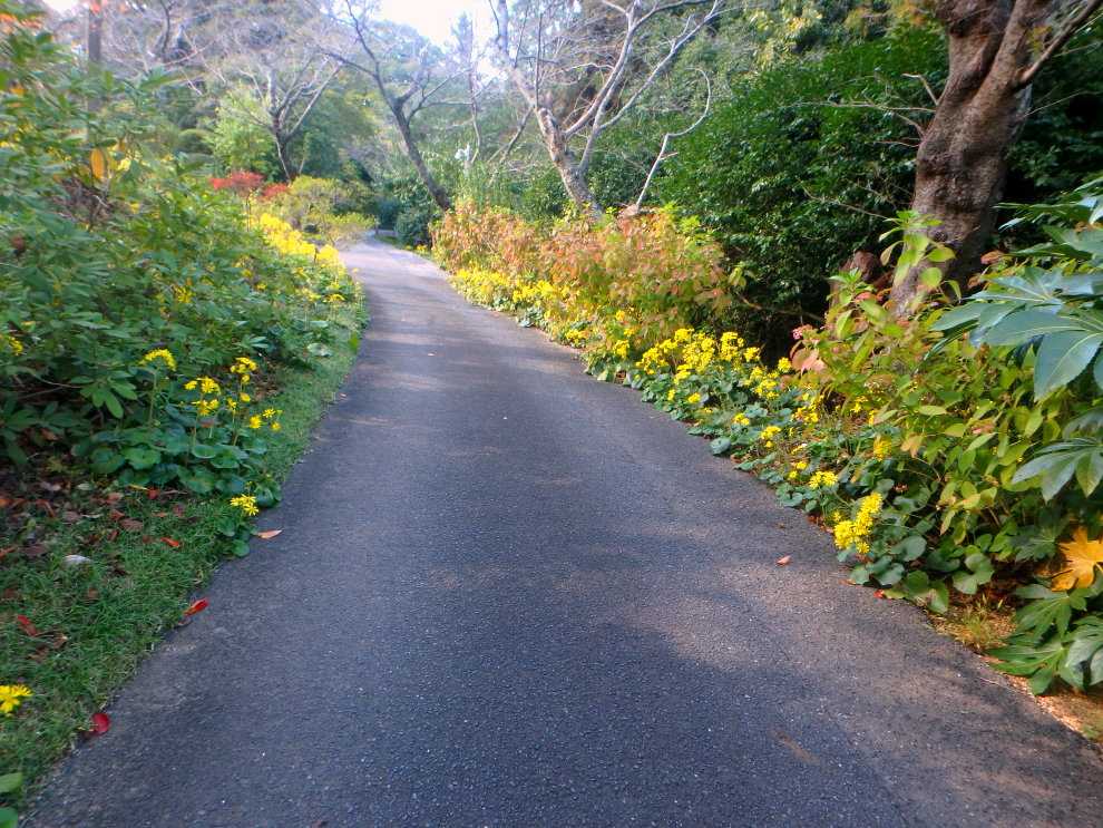 ツワブキロード、原種シクラメン、皇帝ヒマワリ、サンザシ、ヒオウギ…