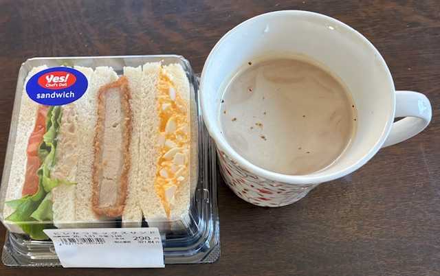 昼食は、ミックスサンド、コーヒー。デザートに、濃い抹茶のクリーム…