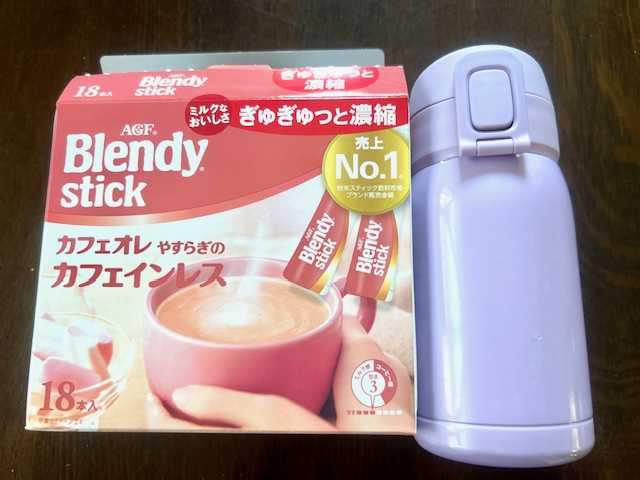 ミニ水筒には、カフェインレスのカフェオレを入れました。