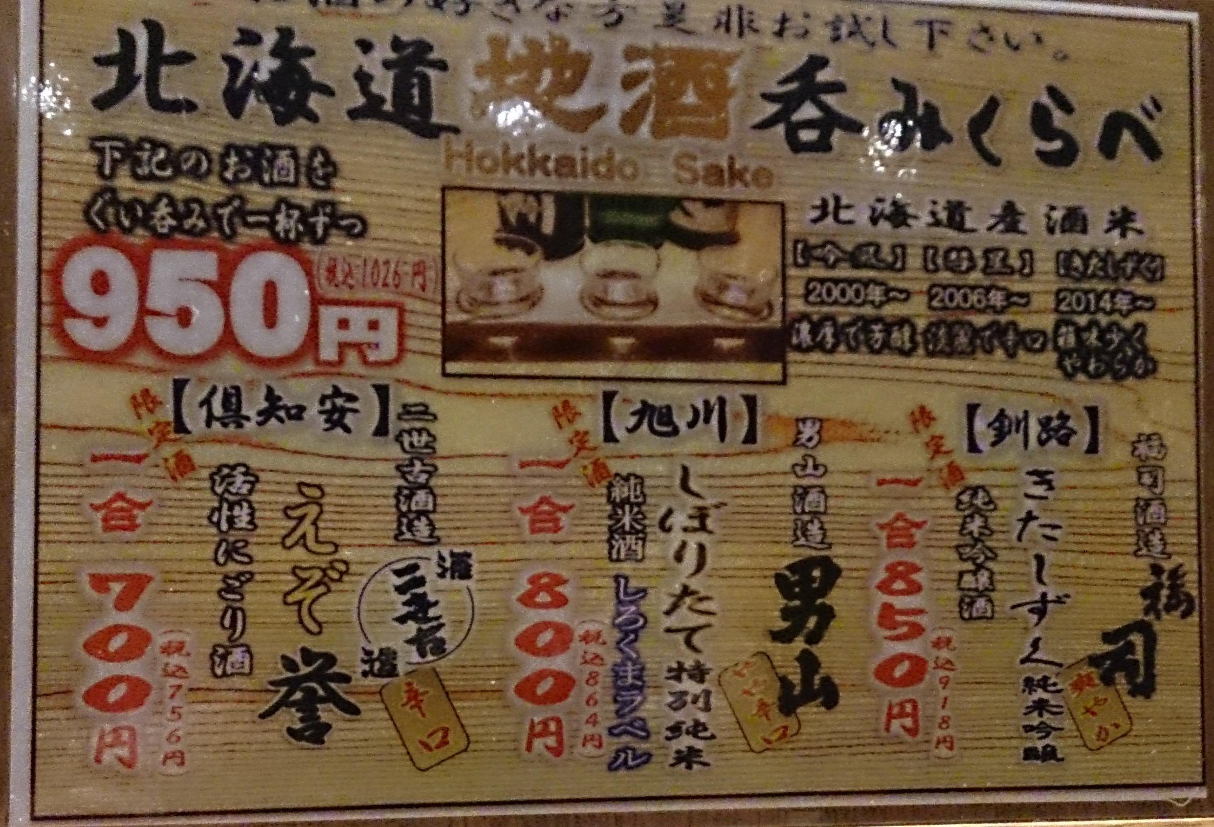 福司酒造:釧路 福司 きたしずく(純米吟醸) 少し酒感 → すっきり → 甘さ残る 男山酒造:旭川 男山 しろくまラベル(しぼりたて特別純米) 少し甘い → すっきり → 少し酒感 二世古酒造:倶知安 えぞ誉(活性にごり酒) にごり発砲 → 濃厚 → 少し酒感 2019.01