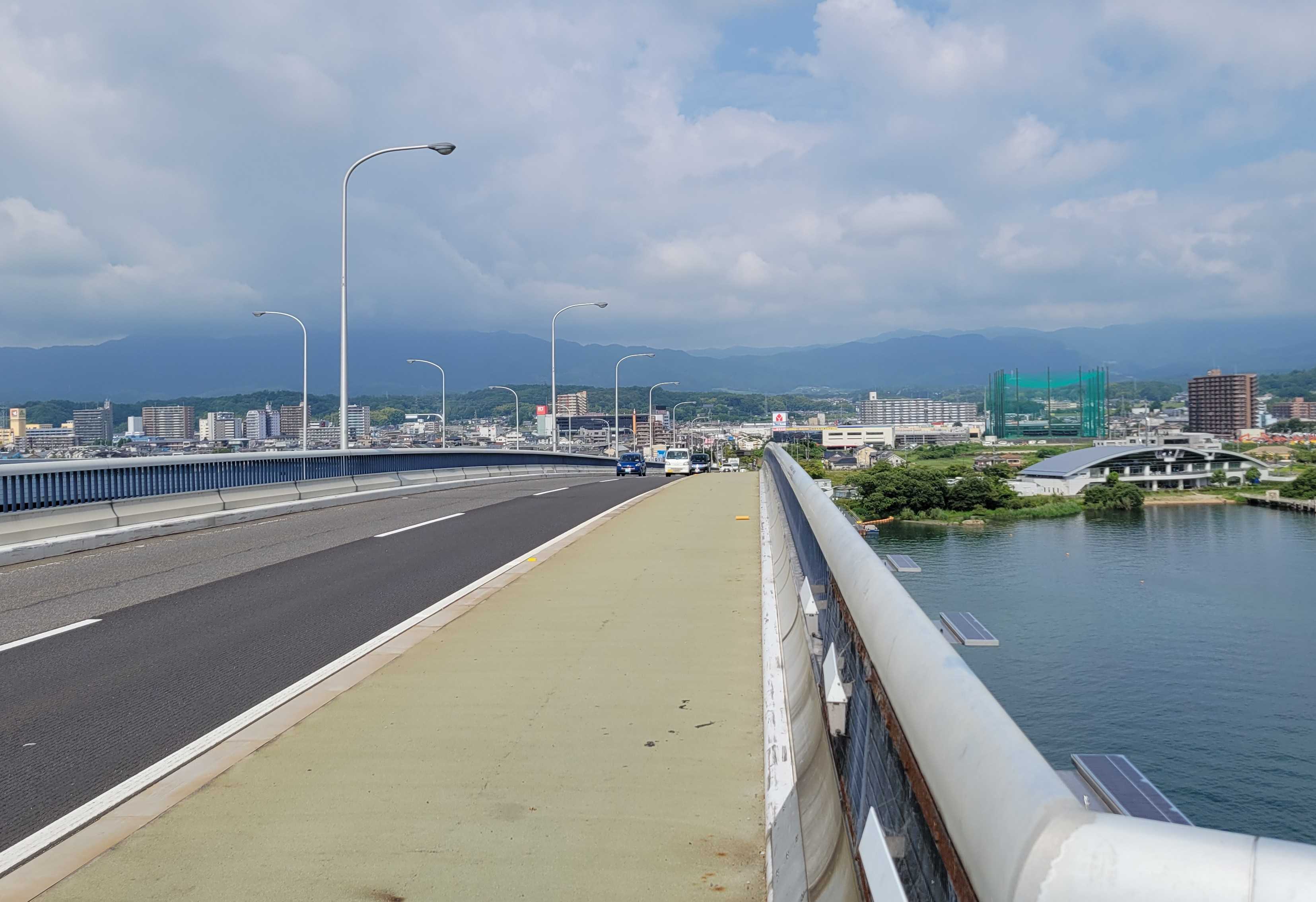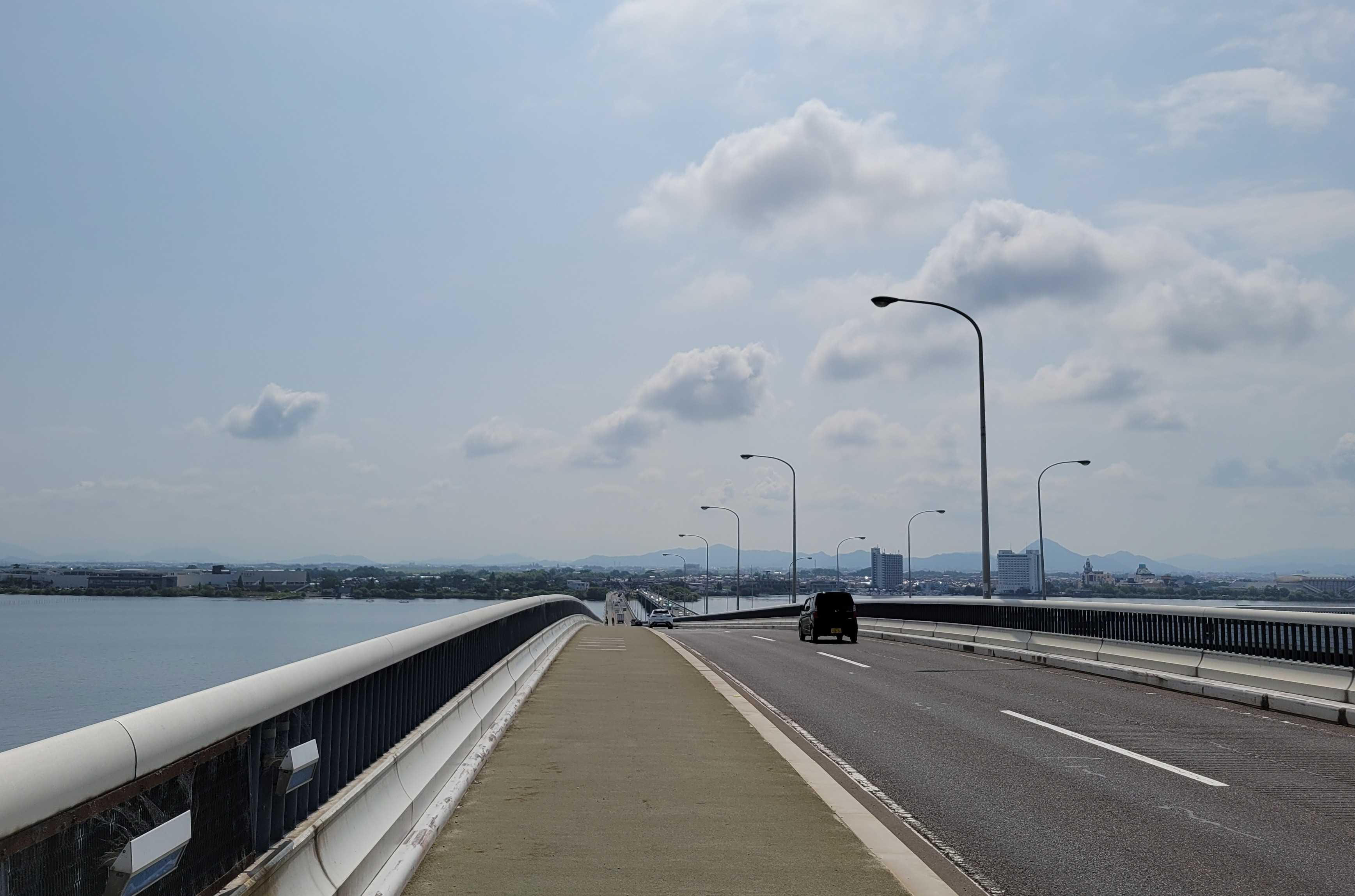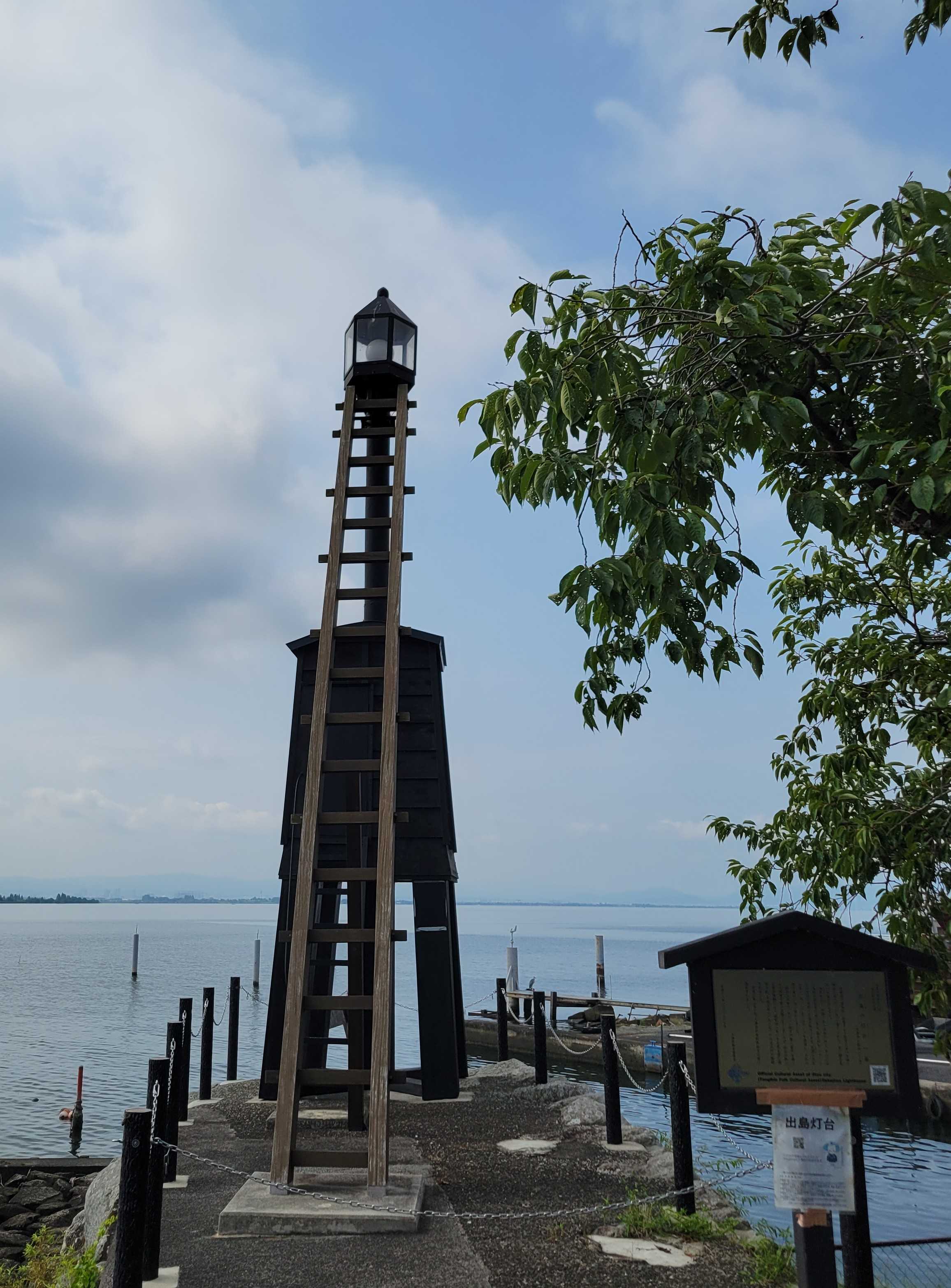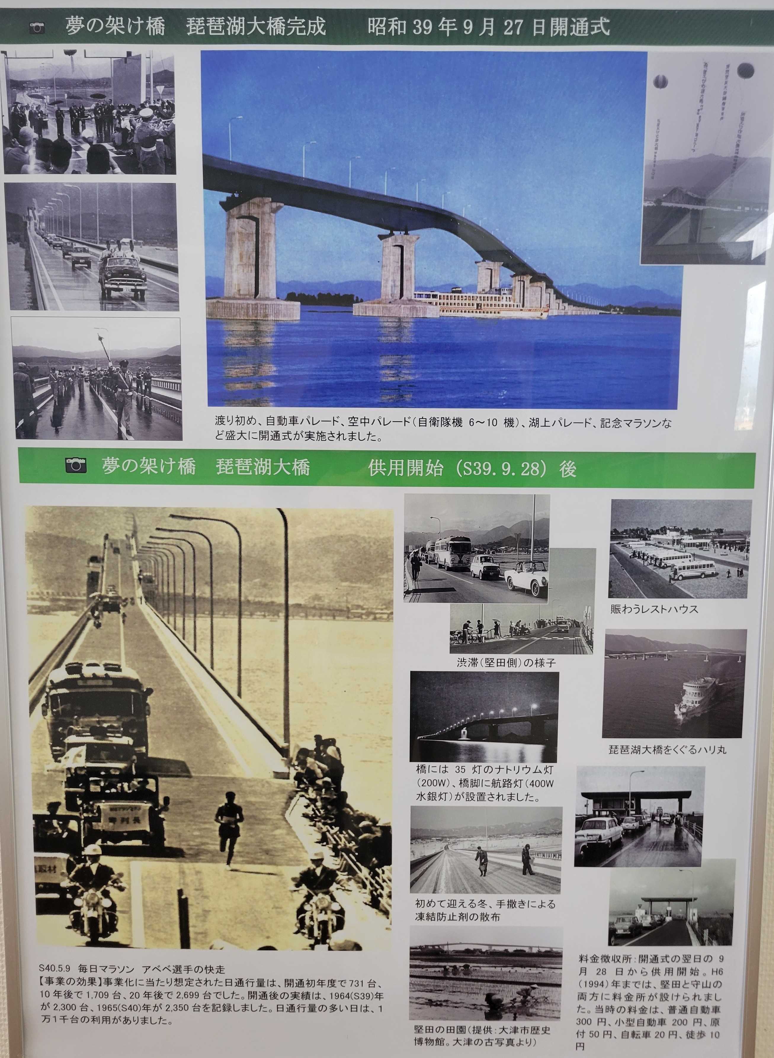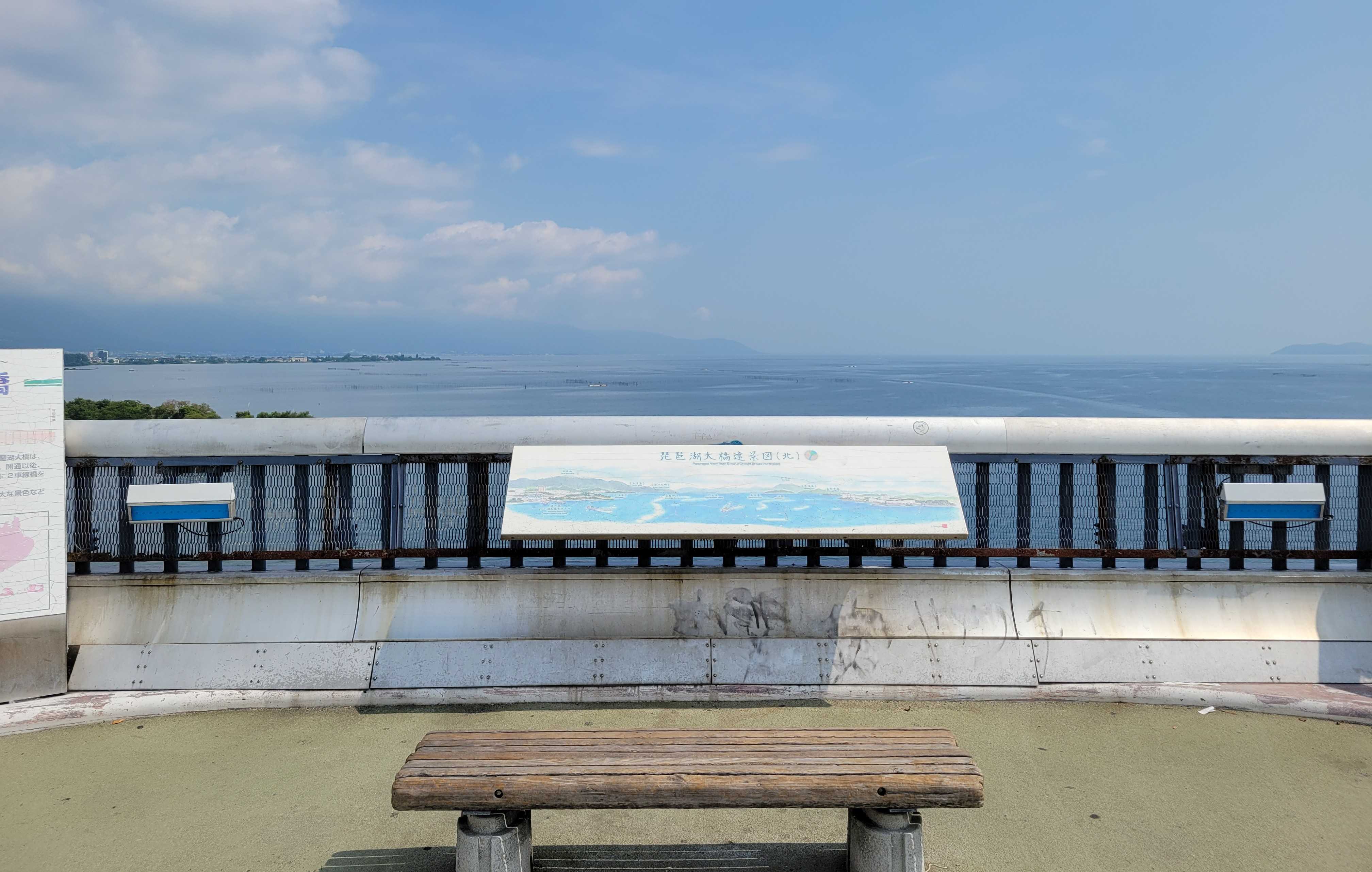 気ままな歩き録。 2025年8月15日 大津市 晴れ 最高気温34℃ 最低気温24℃ 残暑厳しいお盆の日。琵琶湖大橋を歩いて渡ってみた。 ![]() (琵琶湖を跨ぐ巨大構造物) 8月は長距離ウォーキングするにはちょっと危険な季節。 特に、今年の夏は長くてとても暑い。 程よい距離で、無理なく歩けて、歩いた後にゆっくり休めるコースを考えた。 堅田から出発して琵琶湖大橋を渡り守山側へ向かう。 歩いた後は、橋の袂にあるピエリ守山に併設のスーパー銭湯 水春 へ。 Google Mapの示す距離は約8km。 琵琶湖大橋。 徒歩でビワイチでも幾度か渡った橋で、このブログの一番最初に歩いた場所でもある。 橋の歴史と概要。 昭和39年(1964年)9月に2車線で開業。 平成6年(1994年)7月に新しい橋が開通、現在は上り車線橋(新橋)と下り車線橋(旧橋) の4車線で運用されている。 橋の長さは、上り車線橋(守山から大津へ向かう橋)が1,400m、下り車線橋(大津から守山) が1,350m。最高部は湖水面から約26m。 通行料は、自動車・バイクは有料だが自転車・歩行者は無料で通行することができる。 また、下り車線橋の最高部には展望スペースが設けられており、そこからの景観は素晴らしく 琵琶湖の広さを体感出来る眺めだ。さらに、湖を渡る風がひとときの凉も与えてくれる。 琵琶湖も、この橋を境に南側を南湖、北側を北湖と呼ばれている。 8:00 JR堅田駅。 堅田の街並みを少し散策して、大橋西側袂の道の駅びわ湖大橋米プラザを経由し 守山側へ、第一なぎさ公園のひまわり畑をみて、最終目的地の水春に向かう。 既に30℃に迫る気温。 普段使いの水筒の他、予備として冷凍のペットボトルのお茶を1本リュックに入れた。 さぁ歩こう。 ![]() 駅から琵琶湖に向かって直進1kmほど。 堅田内湖。池中心に KATATA のオブジェが。 ![]() 8:30 琵琶湖湖畔に到着。 今日の琵琶湖。やっぱり今年の夏は空気が白い。 ![]() 満月寺浮御堂。 何度も来ているので今日は入園しない。寺の外からのお堂風景。 ![]() 8:50 出島の灯台。 駅から浮御堂を経由して約3km。 幾度か来ているが途次立ち寄り。 ![]() ここから眺める琵琶湖大橋の風景が好き。 ![]() 9:10 道の駅 びわ湖大橋米プラザ に到着。 スタートから約4km。 ![]() 館内はエアコンが効いて最高の休憩ポイント。 2階展望台の室内の床面には滋賀県の全景図がある。 ![]() 琵琶湖の面積は約670平方キロメートル。滋賀県の約1/6を占める。 琵琶湖の大きさ表現の県民あるあるで、びわ湖は滋賀県の1/6に過ぎないことを皆が知っている。 なぜなら、、、 県外の人々の感覚 → 滋賀県=琵琶湖=滋賀県の殆どが琵琶湖で陸地は湖を囲う周辺のみ を正すためだ。 オイラも近江の地に来るまでは 滋賀=ほぼ琵琶湖 と信じていた1人だ。 館内には県内の産業と琵琶湖大橋の歴史を記すパネル展示がある。 橋を渡る前にお勉強。 ![]() メロディーロードの記載が。 琵琶湖大橋は自動車走行でメロディーが流れることでも知られている。 道路に刻まれた溝を走行することでその振動がメロディーになって聞こえるもの。 大津から守山に向かう旧橋の追い越し車線に設置されている。 開業当時の様子を記したパネル。 ![]() そして巨大構造物。 ![]() 9:30 さぁ琵琶湖大橋を渡ろう。 ![]() 橋の上り坂。 ![]() メロディーロードのスタート地点。 中央分離帯側にスタートを示す看板が設置されている。 曲は「琵琶湖周航の歌」この歌の詳細は 徒歩でビワイチリターンズ(8) 参照。 ![]() メロディーを生み出す溝。 歩いていても車が通るとメロディーが聞ける。ドップラー現象気味だけど。 ![]() 9:40 大橋の最高部、展望スペースに到着。 ![]() 涼風が吹くも、やっぱり暑いな、真夏は。 太陽が近くて道路・歩道の照り返しもあって焼けるようだ。 だけど景観は素晴らしい。 北湖の風景。西側(大津側) ![]() 北湖を北に向かって。 やっぱり海だな。 右に見えるのは沖島。 国内唯一の淡水湖内で人が定住している島。 ![]() 東側(守山側) 岬の建物は第1なぎさ公園傍のリゾートマンション群。 ![]() 大橋の大津方面。 ![]() 守山方面。 ![]() 10:00 大橋を渡り終えて守山側の料金所。 ![]() お満灯籠とピエリ守山。 かつて 明るい廃墟 と揶揄されたガラガラモールも今は大人気のショッピングモールだ。 今日もお盆休みで大盛況。 ![]() 水春に向かう前に、少し足を伸ばして、最後の経由地である第一なぎさ公園へ向かう。 この時期はひまわり畑が見頃のはず。 だがしかし、、、 残念な光景。 すべて見頃を過ぎて垂れている、、、 ちと遅かったようだ。 ![]() ・・・ だけどね。 1本たりと残っているひまわりがなく、とはいえ枯れ果てているわけでもなく すべて同じ方向に垂れている。これはこれですごいな と思った。 なかなか見られない光景だろう。 10:30 癒やしの温泉 守山湯元 水春 に到着。 ![]() 露天風呂に浸かって汗を洗い流す。 その後はお決まりのコース。 びわ湖を眺めながらの一杯。至高のひととき。 ![]() 今日もついでに BIWA-TEKU モバイルスタンプラリー 「中世の自治都市 堅田