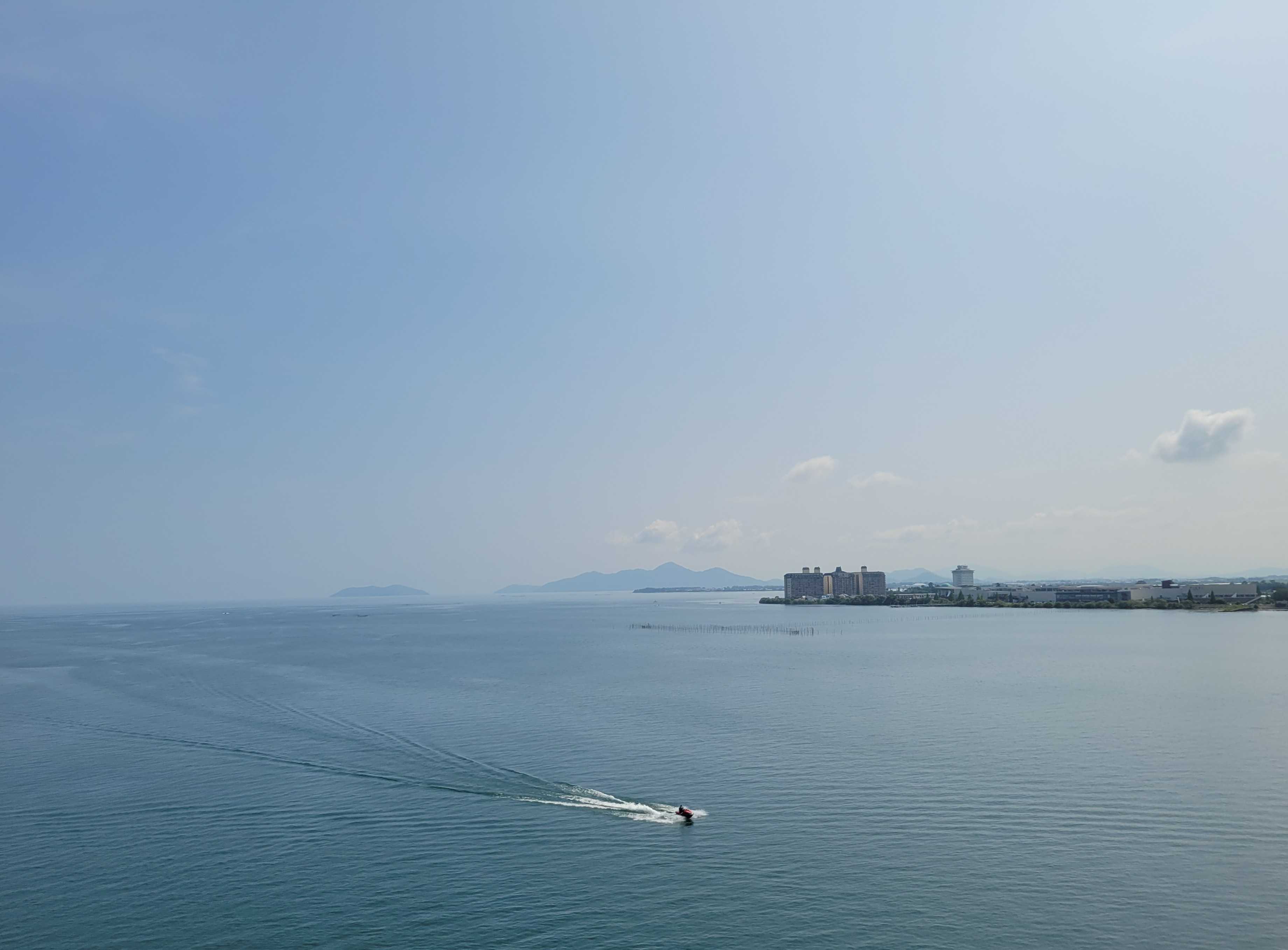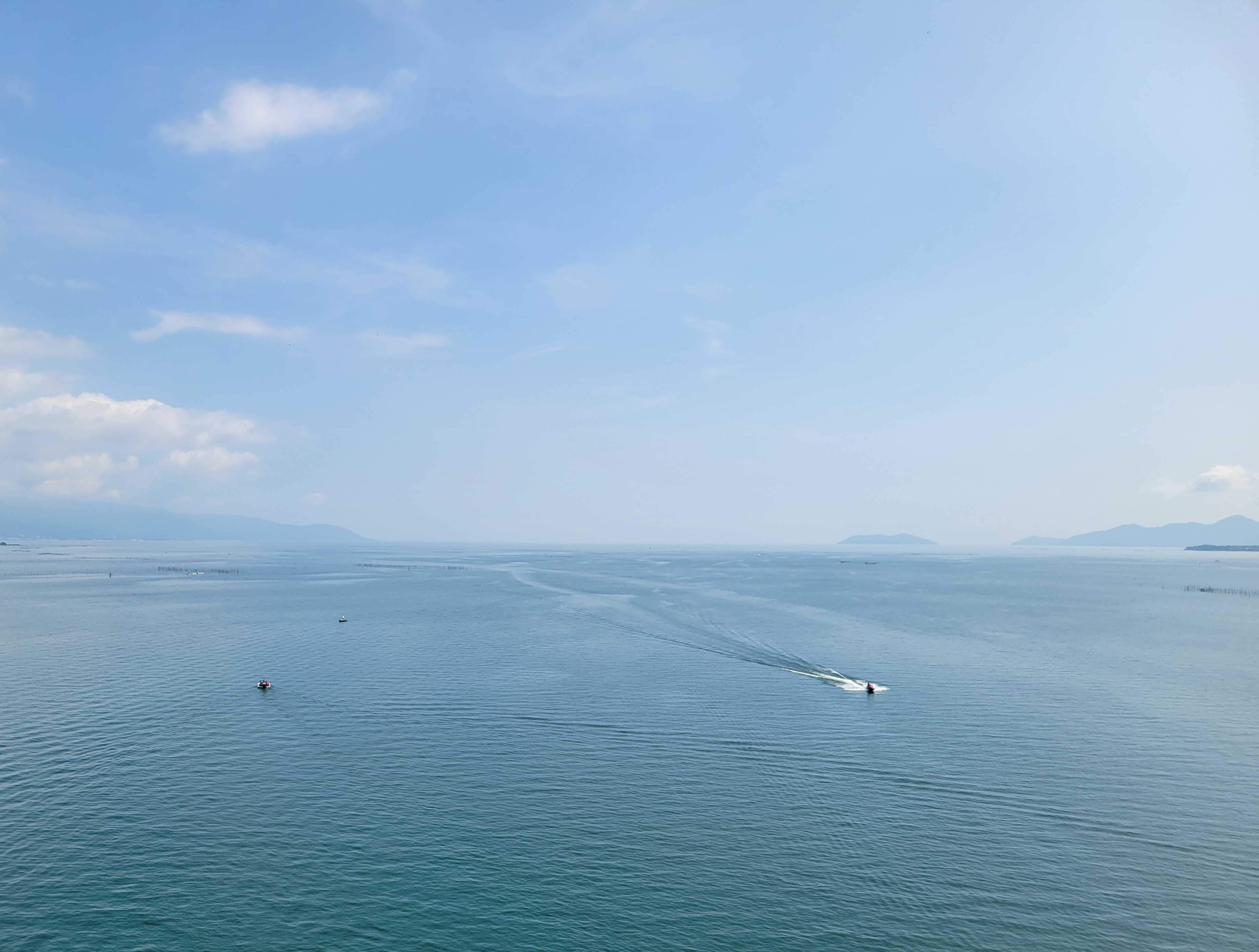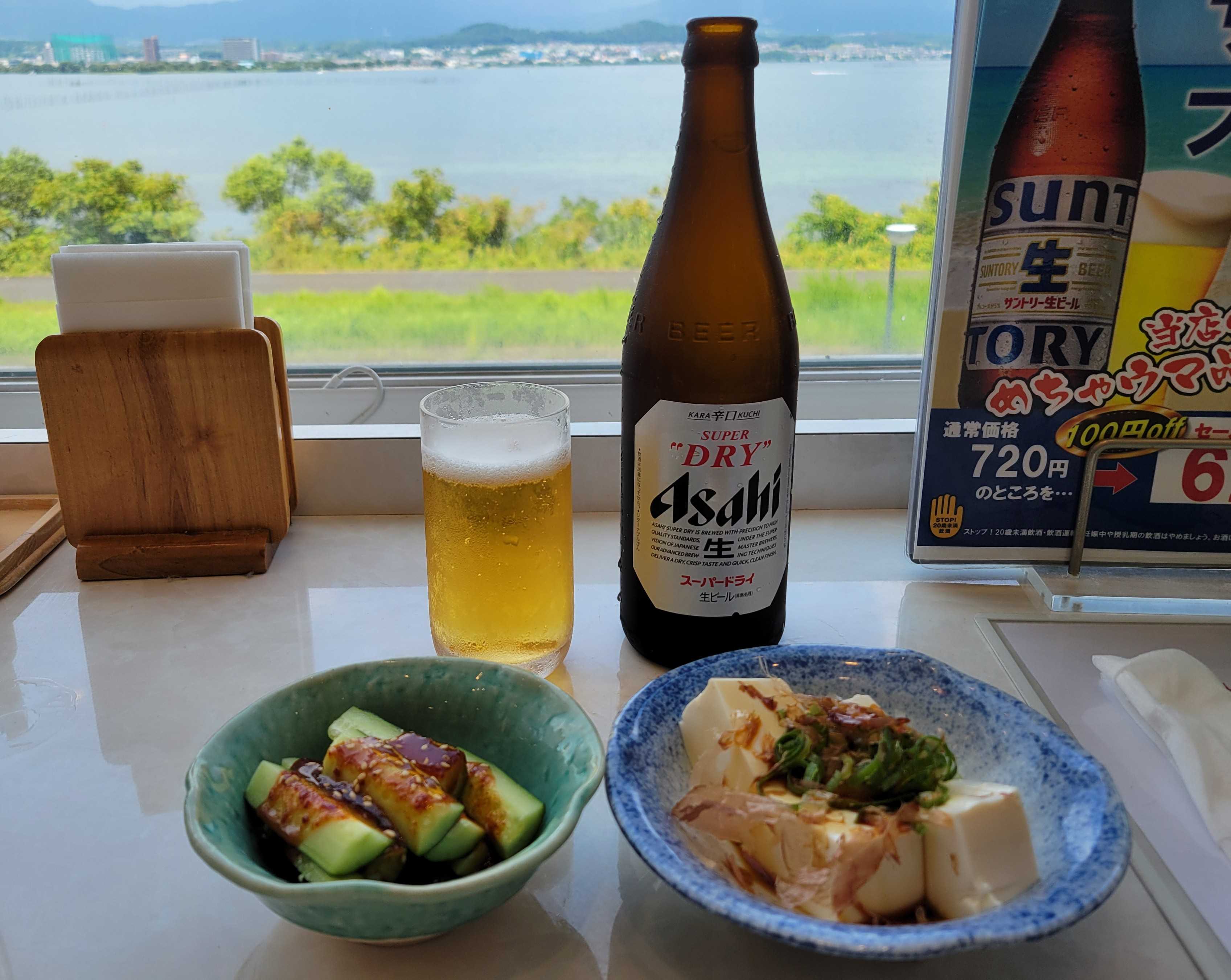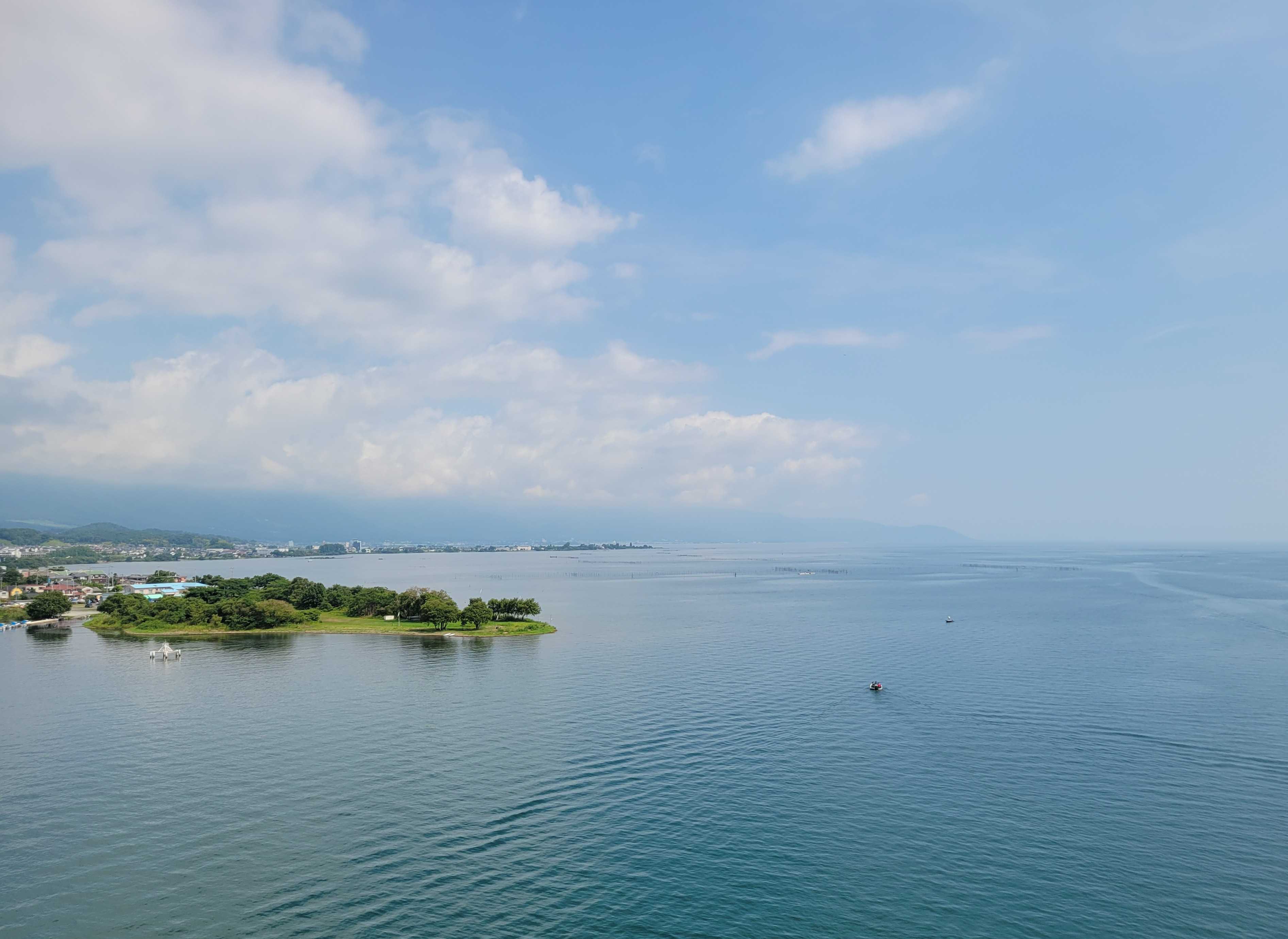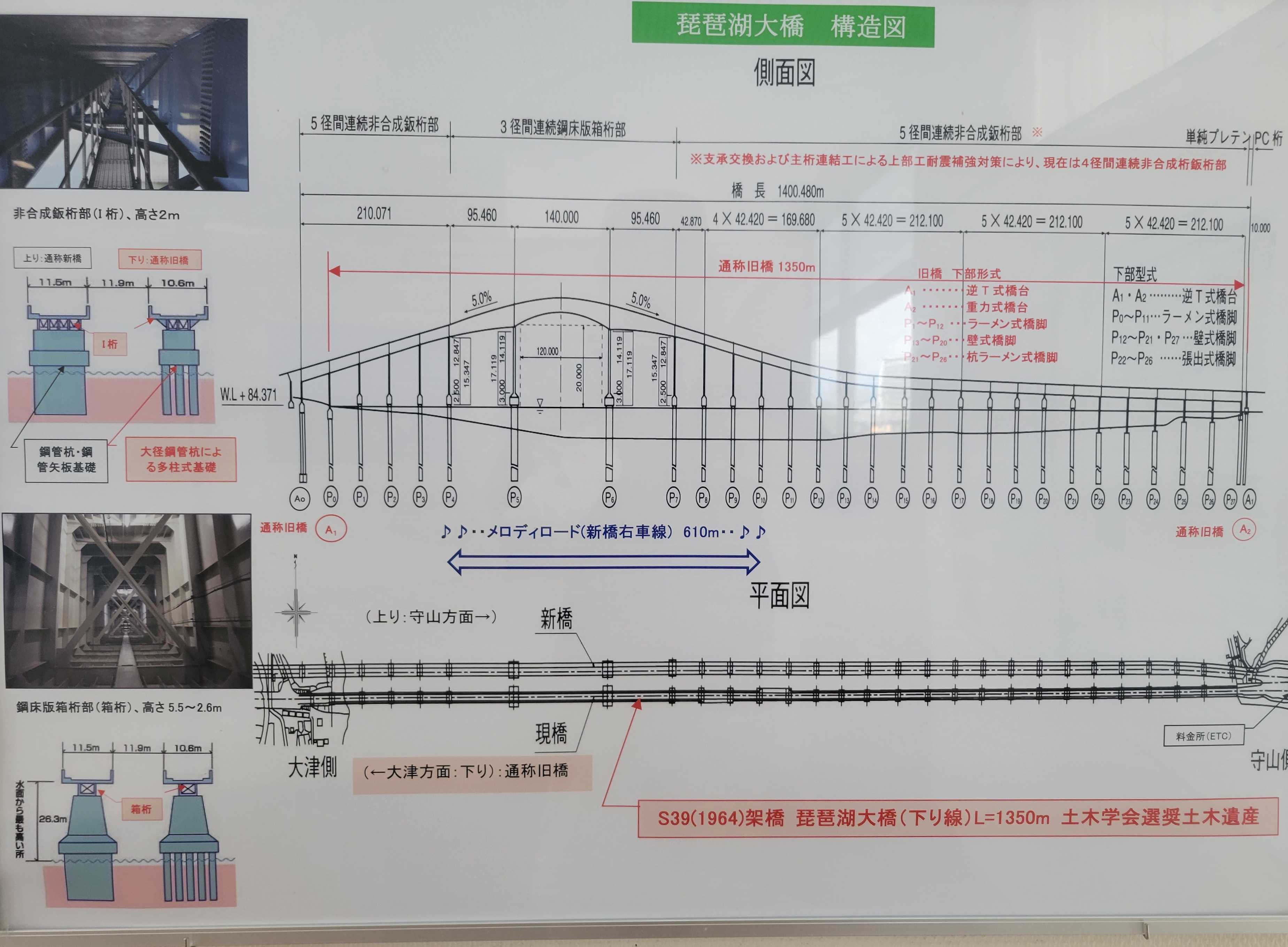 気ままな歩き録。 2025年8月15日 大津市 晴れ 最高気温34℃ 最低気温24℃ 残暑厳しいお盆の日。琵琶湖大橋を歩いて渡ってみた。 ![]() (琵琶湖を跨ぐ巨大構造物) 8月は長距離ウォーキングするにはちょっと危険な季節。 特に、今年の夏は長くてとても暑い。 程よい距離で、無理なく歩けて、歩いた後にゆっくり休めるコースを考えた。 堅田から出発して琵琶湖大橋を渡り守山側へ向かう。 歩いた後は、橋の袂にあるピエリ守山に併設のスーパー銭湯 水春 へ。 Google Mapの示す距離は約8km。 琵琶湖大橋。 徒歩でビワイチでも幾度か渡った橋で、このブログの一番最初に歩いた場所でもある。 橋の歴史と概要。 昭和39年(1964年)9月に2車線で開業。 平成6年(1994年)7月に新しい橋が開通、現在は上り車線橋(新橋)と下り車線橋(旧橋) の4車線で運用されている。 橋の長さは、上り車線橋(守山から大津へ向かう橋)が1,400m、下り車線橋(大津から守山) が1,350m。最高部は湖水面から約26m。 通行料は、自動車・バイクは有料だが自転車・歩行者は無料で通行することができる。 また、下り車線橋の最高部には展望スペースが設けられており、そこからの景観は素晴らしく 琵琶湖の広さを体感出来る眺めだ。さらに、湖を渡る風がひとときの凉も与えてくれる。 琵琶湖も、この橋を境に南側を南湖、北側を北湖と呼ばれている。 8:00 JR堅田駅。 堅田の街並みを少し散策して、大橋西側袂の道の駅びわ湖大橋米プラザを経由し 守山側へ、第一なぎさ公園のひまわり畑をみて、最終目的地の水春に向かう。 既に30℃に迫る気温。 普段使いの水筒の他、予備として冷凍のペットボトルのお茶を1本リュックに入れた。 さぁ歩こう。 ![]() 駅から琵琶湖に向かって直進1kmほど。 堅田内湖。池中心に KATATA のオブジェが。 ![]() 8:30 琵琶湖湖畔に到着。 今日の琵琶湖。やっぱり今年の夏は空気が白い。 ![]() 満月寺浮御堂。 何度も来ているので今日は入園しない。寺の外からのお堂風景。 ![]() 8:50 出島の灯台。 駅から浮御堂を経由して約3km。 幾度か来ているが途次立ち寄り。 ![]() ここから眺める琵琶湖大橋の風景が好き。 ![]() 9:10 道の駅 びわ湖大橋米プラザ に到着。 スタートから約4km。 ![]() 館内はエアコンが効いて最高の休憩ポイント。 2階展望台の室内の床面には滋賀県の全景図がある。 ![]() 琵琶湖の面積は約670平方キロメートル。滋賀県の約1/6を占める。 琵琶湖の大きさ表現の県民あるあるで、びわ湖は滋賀県の1/6に過ぎないことを皆が知っている。 なぜなら、、、 県外の人々の感覚 → 滋賀県=琵琶湖=滋賀県の殆どが琵琶湖で陸地は湖を囲う周辺のみ を正すためだ。 オイラも近江の地に来るまでは 滋賀=ほぼ琵琶湖 と信じていた1人だ。 館内には県内の産業と琵琶湖大橋の歴史を記すパネル展示がある。 橋を渡る前にお勉強。 ![]() メロディーロードの記載が。 琵琶湖大橋は自動車走行でメロディーが流れることでも知られている。 道路に刻まれた溝を走行することでその振動がメロディーになって聞こえるもの。 大津から守山に向かう旧橋の追い越し車線に設置されている。 開業当時の様子を記したパネル。 ![]() そして巨大構造物。 ![]() 9:30 さぁ琵琶湖大橋を渡ろう。 ![]() 橋の上り坂。 ![]() メロディーロードのスタート地点。 中央分離帯側にスタートを示す看板が設置されている。 曲は「琵琶湖周航の歌」この歌の詳細は 徒歩でビワイチリターンズ(8) 参照。 ![]() メロディーを生み出す溝。 歩いていても車が通るとメロディーが聞ける。ドップラー現象気味だけど。 ![]() 9:40 大橋の最高部、展望スペースに到着。 ![]() 涼風が吹くも、やっぱり暑いな、真夏は。 太陽が近くて道路・歩道の照り返しもあって焼けるようだ。 だけど景観は素晴らしい。 北湖の風景。西側(大津側) ![]() 北湖を北に向かって。 やっぱり海だな。 右に見えるのは沖島。 国内唯一の淡水湖内で人が定住している島。 ![]() 東側(守山側) 岬の建物は第1なぎさ公園傍のリゾートマンション群。 ![]() 大橋の大津方面。 ![]() 守山方面。 ![]() 10:00 大橋を渡り終えて守山側の料金所。 ![]() お満灯籠とピエリ守山。 かつて 明るい廃墟 と揶揄されたガラガラモールも今は大人気のショッピングモールだ。 今日もお盆休みで大盛況。 ![]() 水春に向かう前に、少し足を伸ばして、最後の経由地である第一なぎさ公園へ向かう。 この時期はひまわり畑が見頃のはず。 だがしかし、、、 残念な光景。 すべて見頃を過ぎて垂れている、、、 ちと遅かったようだ。 ![]() ・・・ だけどね。 1本たりと残っているひまわりがなく、とはいえ枯れ果てているわけでもなく すべて同じ方向に垂れている。これはこれですごいな と思った。 なかなか見られない光景だろう。 10:30 癒やしの温泉 守山湯元 水春 に到着。 ![]() 露天風呂に浸かって汗を洗い流す。 その後はお決まりのコース。 びわ湖を眺めながらの一杯。至高のひととき。 ![]() 今日もついでに BIWA-TEKU モバイルスタンプラリー 「中世の自治都市 堅田