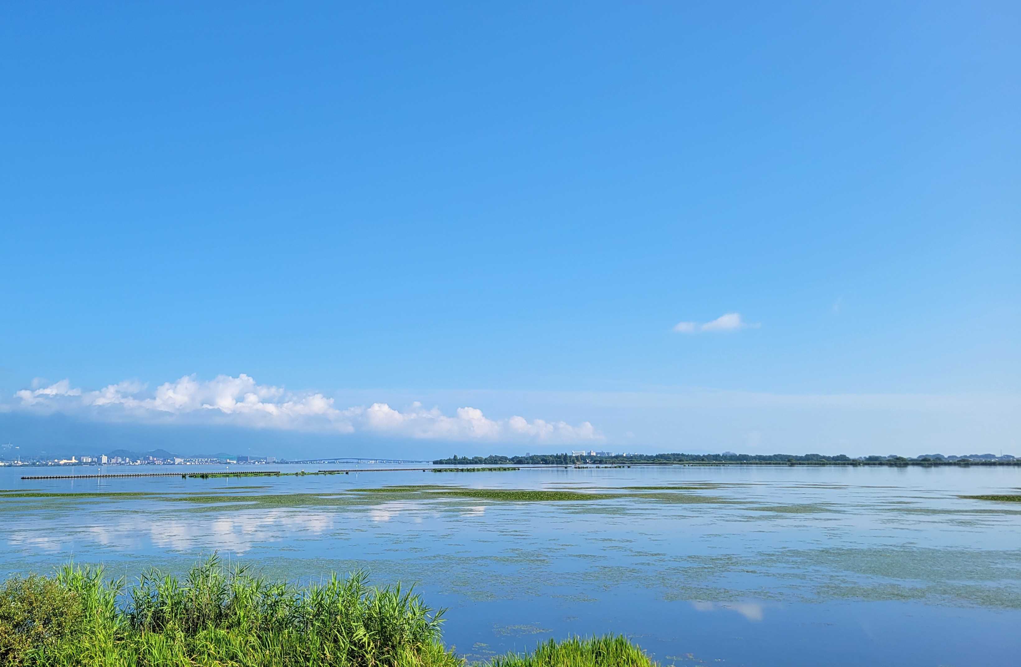 藻が密生している。夏の琵琶湖南湖の定番風景。