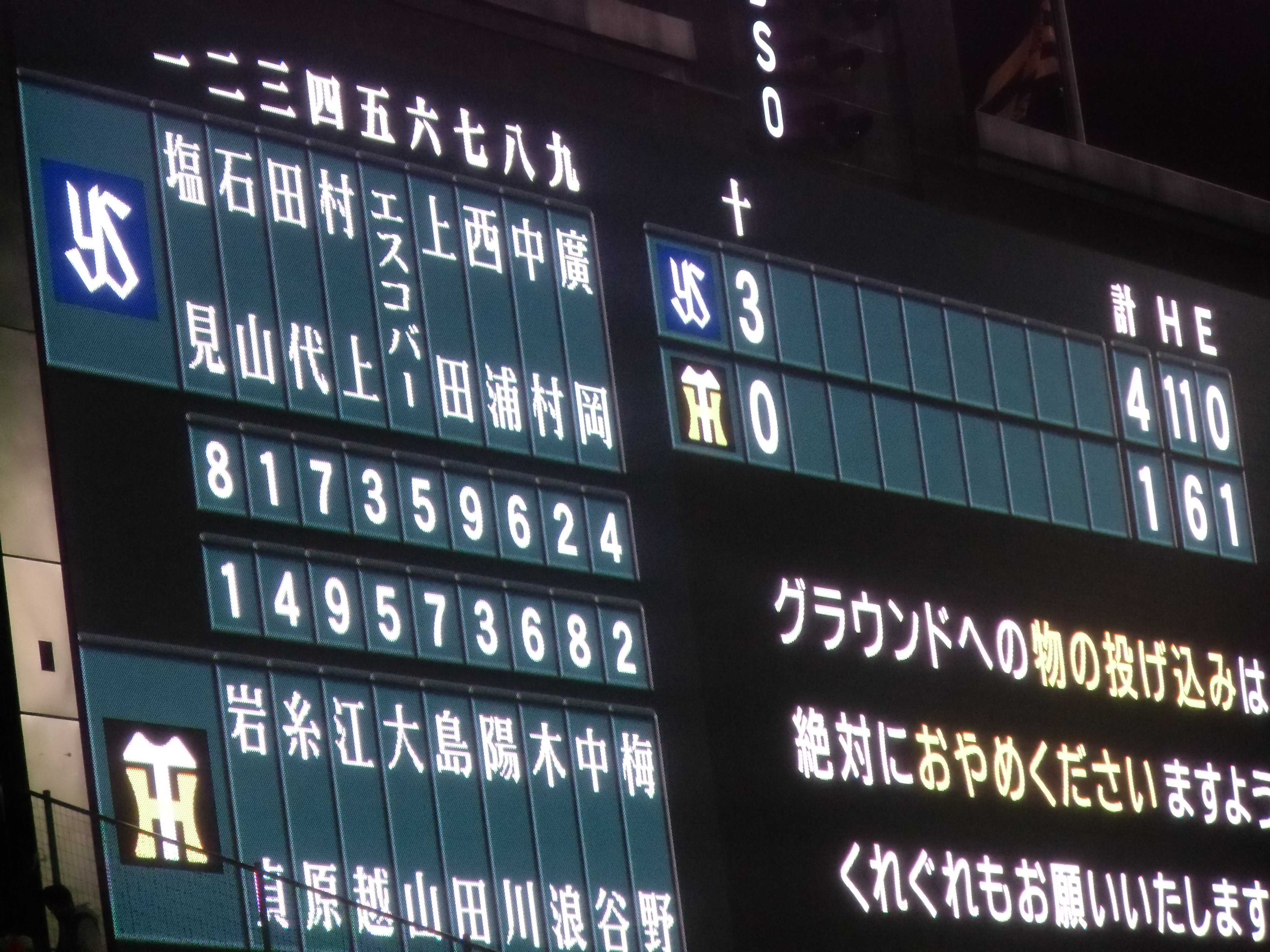 春に取ったチケットは全て払い戻し。 観戦を控えていたこともあり、 11月3日の今日がなんと今年初観戦 観戦記を始めてから19年目ですが、 一番観戦が少なく、またこんな時期での観戦って ホンマ大変な年になりました。 阪神は今日(11/3)の試合を含めて残り6試合。 先発は青柳投手でした。 ![]() 今年は大山選手が一皮むけホームラン26本で 29本でトップの岡本選手にあと3本差の3位です。 打点も82でトップの89打点の岡本選手を追って 現在これも3位です。 ![]() 写真の通り最後は笑ってタイトルを取ったら最高なんやけどな~ 今回は密を避けてレフト外野のチケットを取りましたが、 今季最高の21,340人の入場者数で、 普段より1席飛ばしでギュウギュウでは無いものの マスクを外している人や大声で叫ぶ人が想像以上に多く、 かなり困惑したな~ ![]() 試合は1-0で勝ってましたが、 6回ノーアウト満塁のチャンスに0点 (代打原口も三振) ![]() その流れで7回表に岩崎投手が同点ホームランを浴び同点。 延長10回に岩貞投手が西浦選手に3ランを浴びて終了! ![]() 巨人に優勝を決められ、阪神は大差の2位。 今年はクライマックスがないので完全な消化試合だが、 大山選手や西投手のタイトル争い、近本選手が3割に達するか等が 楽しみやな~ あとは来週の球児の引退試合か~ それと福留選手、能見投手、上本選手などが 阪神のユニフォームを脱ぐ事になり寂しい年になったな~ お気に入りの記事を「いいね!」で応援しよう