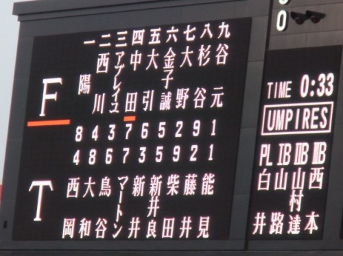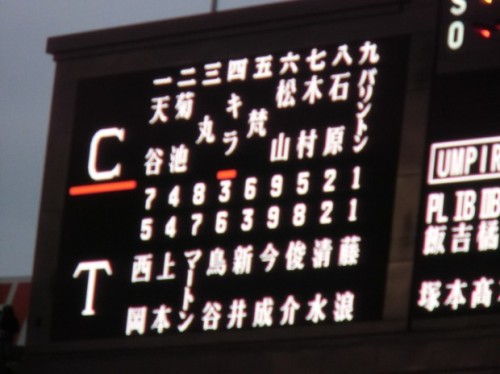 うわーホンマ今日で最後やん<桧山選手の子供さんの始球式。ピンボケですみません!)<5番ライトで先発出場><ライトの桧山選手><バッター桧山選手><7回最後の守備><桧山選手 最後の守備>1打席目がレフトフライ2打席目がセンターフライそして最後の3打席目はファーストゴロ・・<ベンチ前で声援に応える桧山選手>8回の表で交代最後まで出場すると思ってたので、大ショック<ライトスタンドの横断幕>7回裏まで2安打0点に抑えられて、最後の試合やのに、意地を見せて欲しいと願っていた8回。おおおお!!!上本選手のバックスクリーンへの同点3ラン<最終戦は4-3で逆転勝ち!><試合後の引退セレモニー><最後の挨拶><鳥谷選手・関本選手からの花束贈呈>そして胴上げ・・8回<場内1周>いつもファンの事を考えてくれた桧山選手。辛い暗黒時代を経験し、そして2003年、2005年と優勝その後、代打で頑張り22年間本当にお疲れ様でした。そしてありがとうございました。