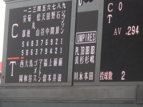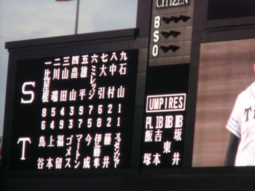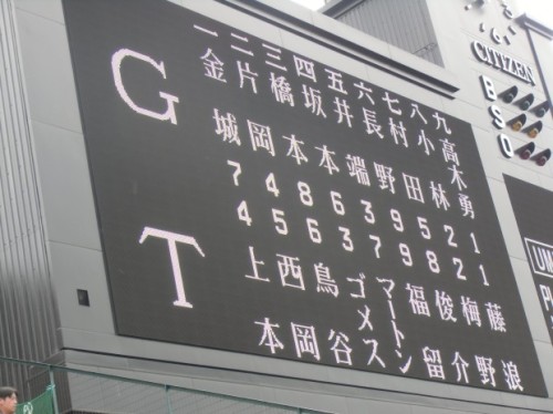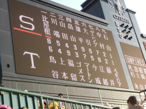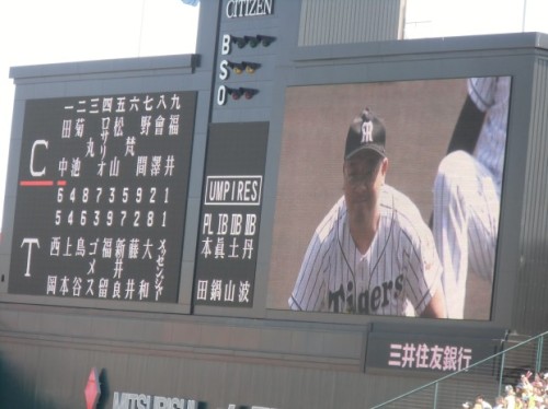 今日はシーズン最終戦。しかも相手は4位広島で、3位の阪神は勝てばCSが決定。負ければ広島の最終戦の勝敗によって3位か4位が決まるというなんともいえない試合で、且つ、関本選手の引退試合。<今季で退任する和田監督>先発は14勝の藤浪投手、広島は男気の黒田投手。<藤浪投手VS打者黒田>試合は情けない事に一方的な試合で6-0で負けてる状態の8回裏、2死1塁で代打、関本残念ながら現役シーズン最後の打席はピッチャーゴロでした。9回表はサードの守備に!<9回ゴメス これが最後か???<これも9回マートン これが最後??ライト前ヒット!>大事な試合をあっさりと負けてしまいましたシーズン終了の挨拶和田監督からのコメントはありませんでした。そして関本選手の引退セレモニー<最後まで見届けてくれる心温かい広島ファン>広島の新井選手より花束場内一周そして胴上げ19年間タイガース一筋御疲れさまでした!そしてありがとうございました!タイガースは70勝71敗と負越してペナントレースを終了。勝率5割を切ってCSというのも虫がいいので、来シーズン新監督の下、頑張って欲しいです!という事で今年も御疲れさまでした