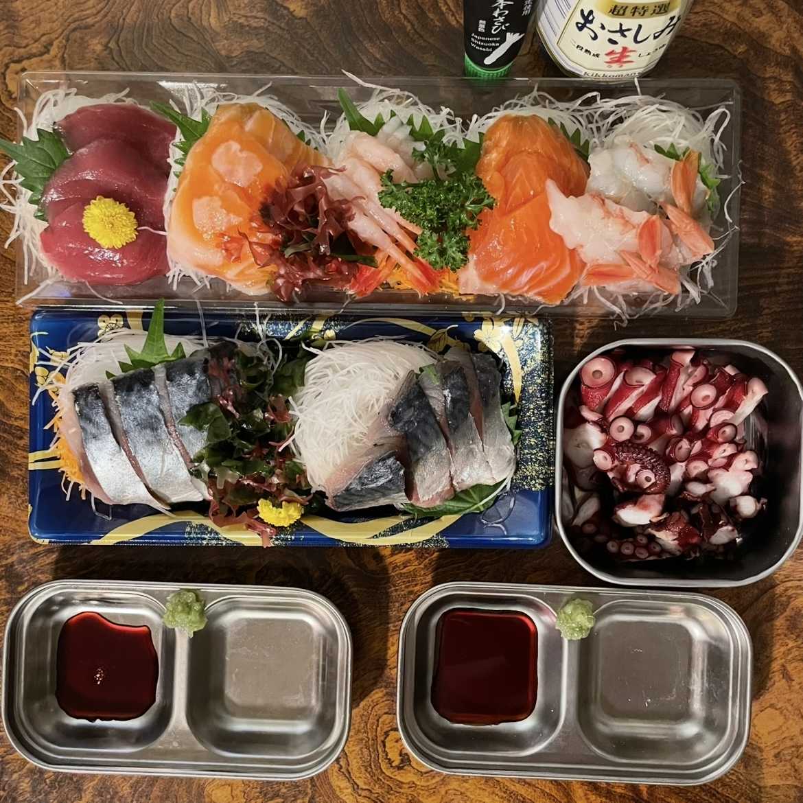 夜:刺身、ご飯、鶏手羽元肉煮とさつまいも1カット(味見)