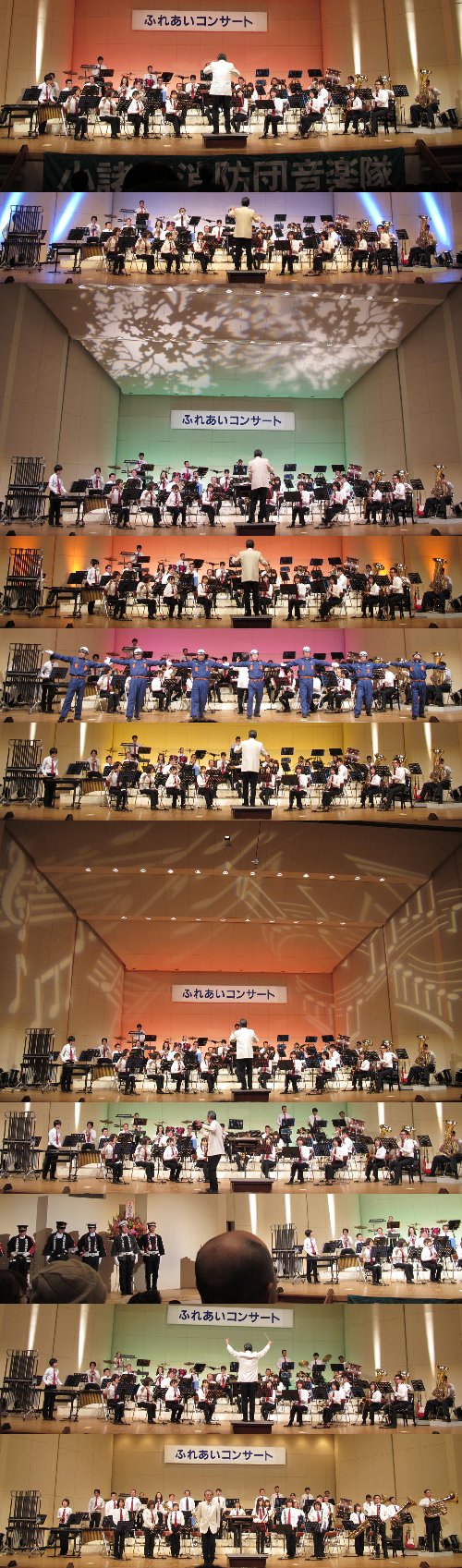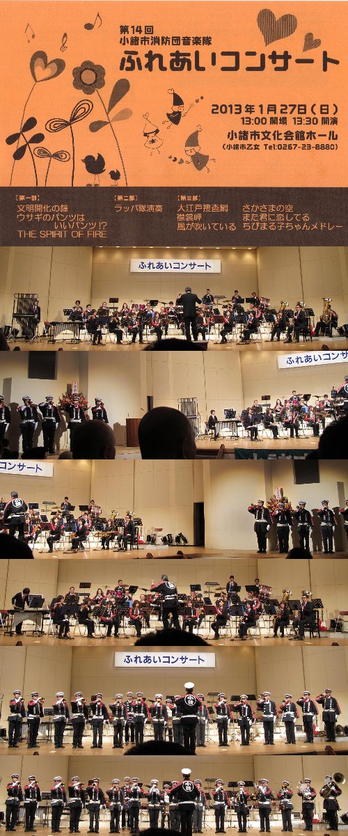 開催日:2013.1.27(日) 13:30開演場所 :小諸市文化センター(712名収容)2013年における県下の消防音楽隊の初演奏会となる小諸市消防音楽隊のふれあいコンサートに2年ぶりに行ってきました。プログラム第3部4.大江戸捜査網5.襟裳岬6.風が吹いている7.さかさまの空8.また君に恋してる9.ちびまる子ちゃんメドレーアンコール部10.ダンシング・シスター11.信濃の国レポート大江戸捜査網ジャパグラ10に入っている変拍子の曲というイメージが強いですが、編曲が変わってもホルンが主役なのは変わらないようです。襟裳岬前後間奏のトランペットのソロが大変素晴らしいです。やはり歌謡曲はトランペットに歌の心がわかる方がいるのといないのとでは、聴衆に訴える力が大きく変わるのかも・・・と思った次第です。風が吹いている既に2012~2013年の裏課題曲間違いなしという程、あちこちで演奏されていますが、フリューゲルホルンを用いて曲の持つ暖かい雰囲気のメロディーをトランペットの直線的な音で壊さぬよう気を使っているのが、とても好印象でした。改めて曲作りのための楽器選定ってすごく大切なのかも・・・と勉強になった気がしました。さかさまの空こちらは朝ドラの「梅ちゃん先生」のオープニング曲ですが、スマップの得意とするまったり系のサウンドの雰囲気が良く出ていました。余談ながら私は朝ドラは欠かさずチェックしているのですが、「梅ちゃん先生」では坂田医院の坂田先生が好きなキャラクターだったのですが、地域の開業医の先輩として梅ちゃん先生の良きアドバイザーとなるものと思っていたのに、あのシナリオはちといただけないという想いがありました。また君に恋してる恒例になっている分団長の皆さんのパフォーマンスがありました。いつもながら工夫をこらした演出には恐れ入るところです。ちびまる子ちゃんメドレー楽しいちびまる子ちゃんの曲で大いに楽しめました。ステージを締めくくるにふさわしいかもという感じです。ダンシング・シスターおなじみの曲なのですが曲名わからず・・・でしたが、当ブログにコメントして下さったに教えていただきすっきりしました。ノリノリのダンシングサウンドがGoodでした信濃の国長野県の音楽団体が良くアンコール曲として採用している曲ですが、曲調の変化する4番でエンディングナレーションを入れるというナイスな組み立てに「これいいかも!」と思いました。まとめ第3部はポップス曲をまとめたステージでしたが、体操あり、ソロあり、ステージ全体を使った影絵の演出ありと変化に富んだステージで見ごたえ聴き応え十分でした。