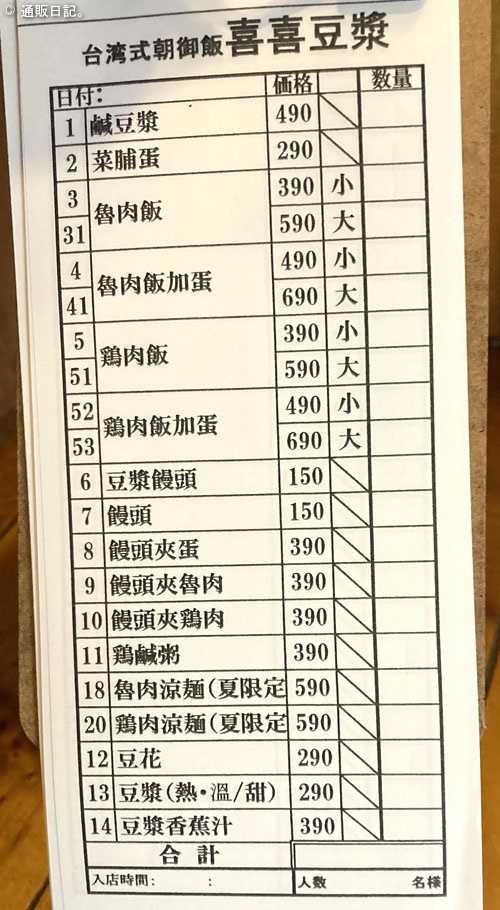 雑色駅からスグなので、アクセスは便利です。google地図でいうとココ。 ![]() 雑色 喜喜豆漿(キキトウジャン) その営業時間は 平日であれば9:00~14:00(L.O.13:30)、土日祝であれば8:00~14:00(L.O.13:30)と、朝から台湾料理が味わえる珍しいお店です。 注:月曜定休&不定休アリ この日は日曜日だったので、お店の外に待ちのお客さんで賑わっておりました。狙うなら平日かな? ![]() 雑色 喜喜豆漿 写真付きメニュー メニューは上記の通り、台湾式の朝ごはんからデザートまでを一通り楽しめるラインナップになっていました。。 ![]() 雑色 喜喜豆漿 注文の流れ 注文の流れは以下の通りです。 1.テーブルにあるメニュー付き注文伝票に数量を記入する。 2.伝票をカウンターに渡す(フロアの店員さんに渡してもOK) 3.料理が出来たら呼ばれる(フロアに店員さんいらっしゃれば運んでくれます) 4.食べ終わったら返却口へ(フロアに店員さんいらっしゃれば運んでくれます) 水とおしぼりはセルフサービスです。 かなり省力化が図られている感じですね。 ![]() 台湾式朝御飯 喜喜豆漿 注文伝票 右側の数量欄に数字を入れるだけなので簡単ですね。 そして多くのメニューで小サイズが選択できるのは嬉しいです。2人で4品もお願いすれば、かなりのバリエーションが楽しめます。 ![]() 喜喜豆漿 魯肉飯 豚肉の煮込みのっけご飯(小) まずは台湾屋台メシの大定番、魯肉飯(ルーローハン)! 魯肉飯(ルーローハン)とは豚肉のバラを甘辛のタレでトロトロに煮込んで白米に乗せたもので、テレビドラマ「孤独のグルメ」で、主人公が台湾出張に行った際に魚肉飯と言っていたアレです。 喜喜豆漿さんの魯肉飯は煮込み…というより、水分が飛んで豚ひき肉の佃煮みたいになっていましたが、ほんのり八角が効いてこれはこれで美味しいです。 ![]() 喜喜豆漿 菜脯蛋 干し大根の玉子焼き 香港の大根餅みたいな食感を想像していたのですが、大根の食感が良い具合に残ってますね。 ご飯モノの脇にこれがあると嬉しい感じです。 ![]() 喜喜豆漿 鶏鹹粥 鶏肉スープのお粥 日本に居て朝からお粥を外食で頂けるなんて…と、少しシアワセな気分になります。 鶏肉の良いダシが少しの生姜で締まっていて美味しい~。できればお酒飲んだあとのシメにしたい。(笑) 鶏肉スープが無くなり次第終了するメニューなのでお早めにどうぞ。 ![]() 喜喜豆漿 鹹豆漿 塩味の豆乳スープ 鹹豆漿は台湾で大人気の朝食なのだそうですね。 温めた豆乳に干しエビや青ネギなどを加えてラー油と醤油で味を調えた台湾風スープのことです。酢を加えるとおぼろ豆腐のようなフワフワ食感が味わえます。 これがまた茶碗蒸しのようにダシが効いて美味しいです。身体にも柔しそう。 油条(揚げパン)がスープを吸って、これも美味しい…たまりません。 ![]() 喜喜豆漿 豆花 台湾風豆乳プリン そしてデザートも良いタイミングで出して下さいました。 豆乳のプリンは優しい甘さ、小豆や落花生がトッピングされた豆づくしのスイーツです。 いや~、台湾を堪能させて頂きました! また現地に行きたくなるような、そんな感覚を思い出させてくれる良いお店です。 ちなみに、普段はご主人お一人でお店を切り盛りされているようですので、手間をかけさせないように配慮しましょうね~。 お気に入りの記事を「いいね!」で応援しよう