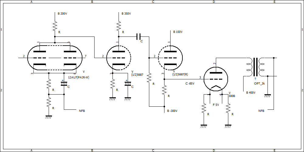 ![]() 電源トランスの6.3V巻線を用いて、5.0Vを取り出す。チョークコイルをかませてから、TRによるリップルフィルターに導く。これで、雑音は0.2mV程度となり、ハムは全く検出できなくなった。めでたし、めでたしである。 ![]() 前段の球のヒーター電源も、電源トランスの7.5V巻線を活用して同じ回路で出来ると思ったが、ここで1つ重大な問題があることに気が付いた。それは、5687のH-K間耐圧である。上の回路図において、2段目の5687のカソード電位は+70V程度、3段目のカソフォロ段のカソード電位は-90V程度となる。実に160Vの差があるわけだ。一方、5687のH-K間耐圧はピークで±100Vなので、到底収まらない。武末数馬氏などは、このような回路構成において12BH7Aを好んで用いていたが、こちらはH-K間耐圧が±200Vあるのだ。さて、どうしたものか。 結局、2段目もカソフォロ段もパラレル接続にすることになりそうである。カソフォロ段のヒーターはAC点火にしよう。それにしても、モノーラルのシングルアンプでありながら、前段に3球も投入することになるとは・・ お気に入りの記事を「いいね!」で応援しよう