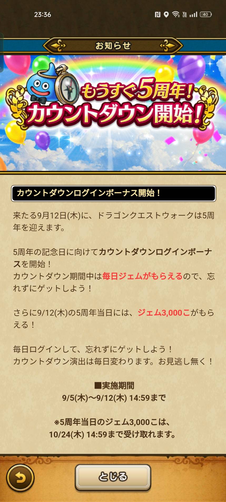 そんなこんなであと1週間でドラクエウォークも5周年を迎えますので