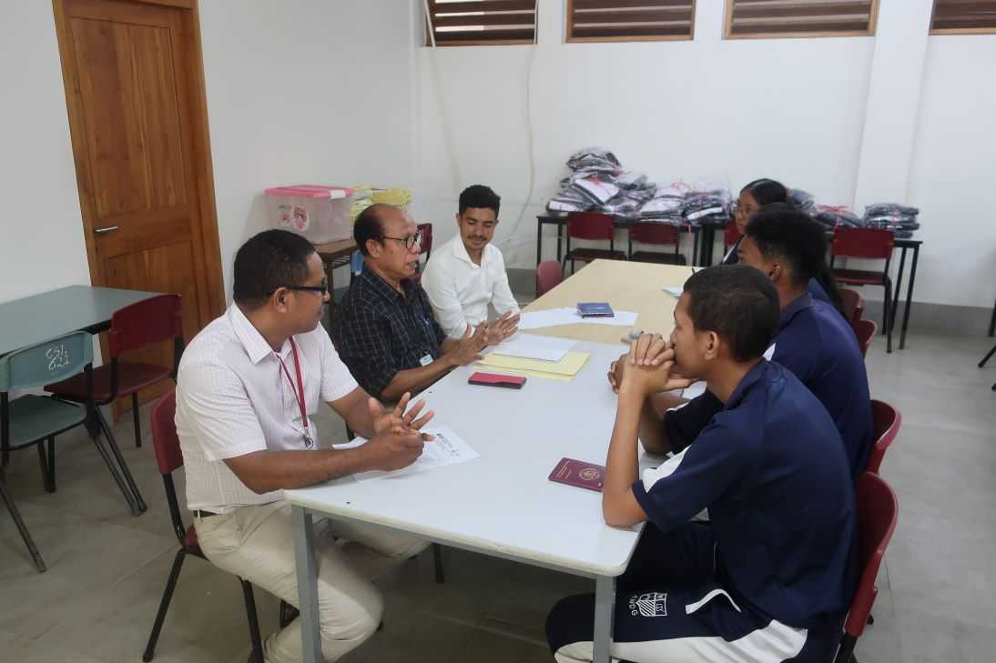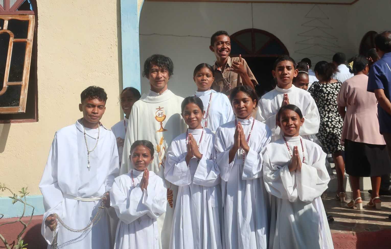 先週の木曜日、日本の高知県から高校1年生と2年生の6人が聖イグナチオ学院にやってきました。日本は昨年から、インドネシアやベトナム、フィリピンからと同じように、東ティモールからも外国人労働者を受け入れるようになりました。その第1陣として8名の東ティモール人が高知県に働きにでかけました。その縁で、高知県から高校生が「東ティモールってどんな国、東ティモール人ってどんなの」ということを探求するためにやってきました。 ↑ 全校生徒から歓迎をうける高知県の高校1年生と2年生 ↑ 日本の高校生の出し物もありました プロジェクターをつかって日本の紹介をしています 日本から通訳のかたも一緒にこられて、インドネシア語で説明してくださったので、日本語がわからなくても大丈夫 ↑ 歌の披露もありました ↑ 高知県の生徒から、お土産の贈呈 ↑ 日本の高校生は東ティモールの民族衣装を着て、ステージに再登壇 するとダンスの音が流れてきたので、聖イグナチオ学院の生徒たちもステージにあがってテベダイ(地面を踏む)の踊りをしました この踊りは、「みんなわたしたちは友だちだ」という意味です ↑ 全校生徒一緒に記念写真 ↑ 6人の高知県の高校生は、土曜日の夕方、もういちどウルメラ村にやってきて、聖イグナチオ学院基金から奨学金を貰っている生徒の家にゆきました どても楽しかったようです 高知県の高校1年生と2年生が、東ティモールの村にやってくるのは、けっこう衝撃的だったかもしれません