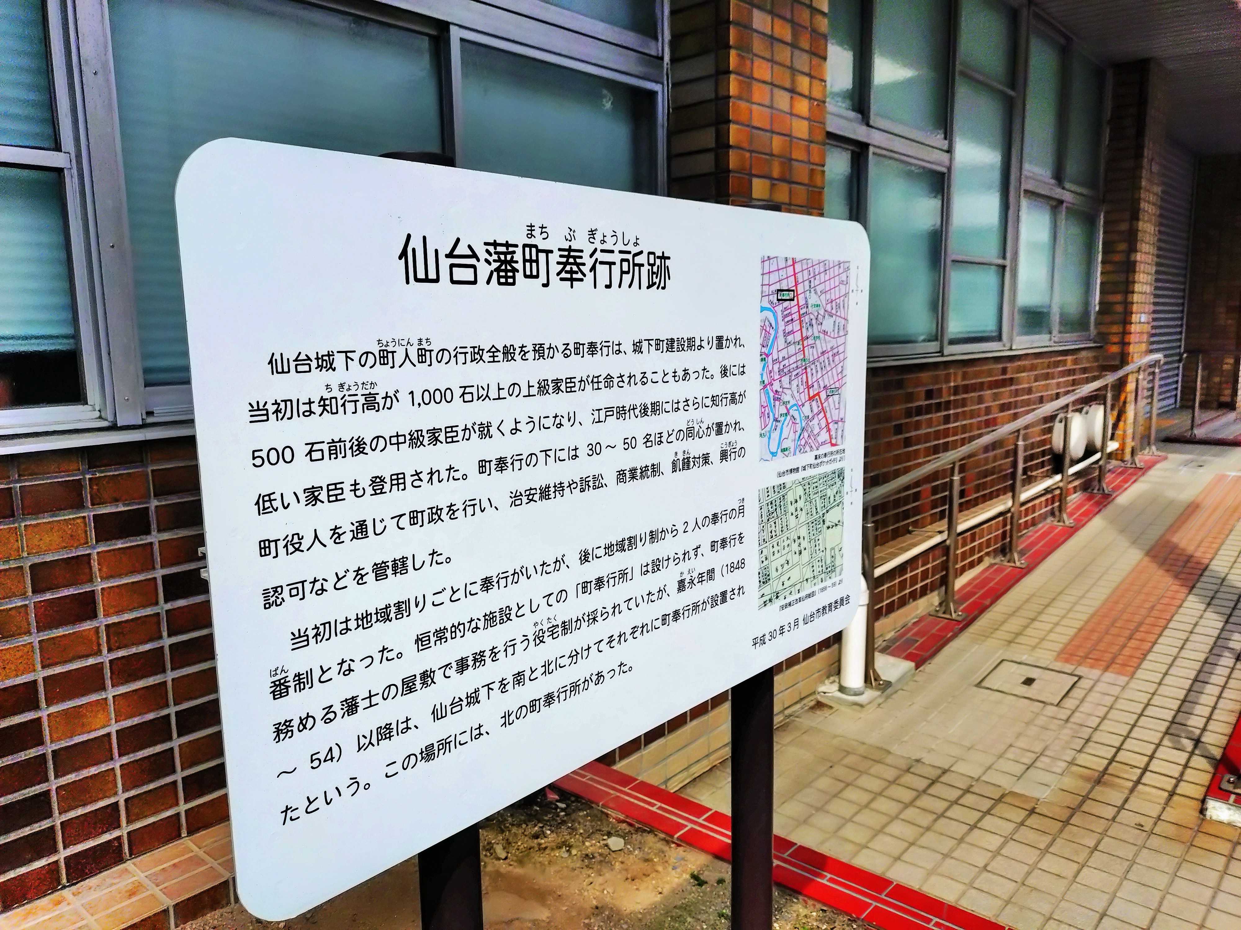 もうひとつ、仙台市役所二日町分庁舎前に、市教育委員会が立てた看板があり、この場所に「仙台藩町奉行所」があったことを説明していた。(ただしここは藩政時代には二日町ではなく西隣の町にあたる。)