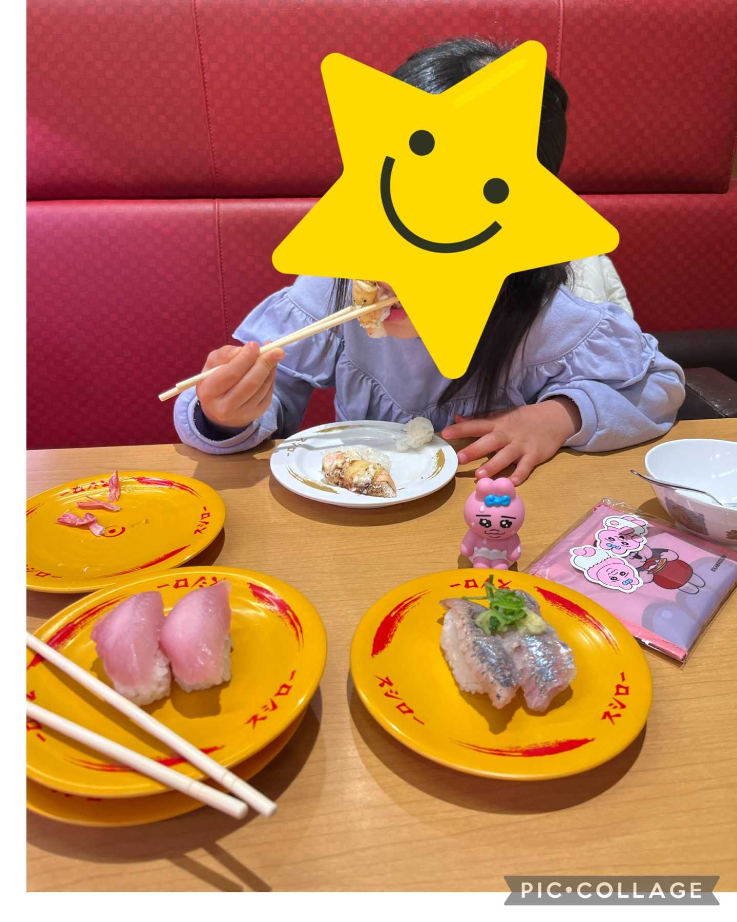 おぱんちゅうさぎ好きな娘達と、コラボ開始日にスシローに行ってきました🍣 コラボ開始日は混んでて、予約したけど結構入るまでに時間がかかったのです💦 娘👧(5)は、お家にあるおぱんちゅうさぎフィギアを持って行って、推し活撮りしていました☺️ いつもは、いくら、甘エビ、マグロ3皿しか食べない娘ですが、推しコラボということで、5皿も食べました😆 推しの力は偉大です🍣 お店中至る所におぱんちゅうさぎが溢れていて、 娘も楽しく過ごしておりました☺️ 最後にパフェも食べたかったけれど、お腹いっぱいで食べられなかった娘👧。 残念そうにしていたので、 コラボ中にまた来たいなと思うワーママちゃんでした🤓