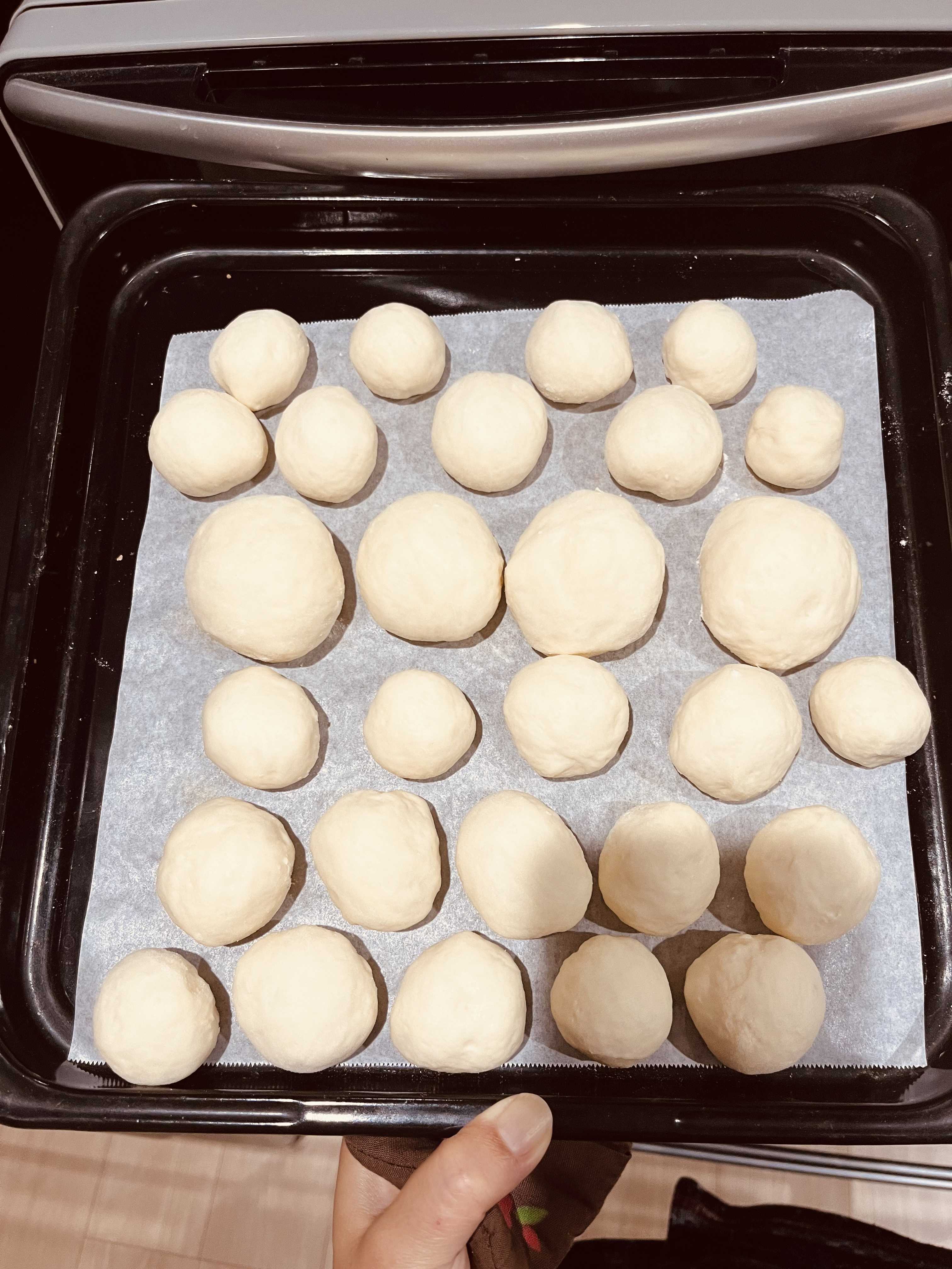 おはようございます🌞 今日のパンはこちら🍞 丸パンです🥯 いつもは、はじめに生地を四等分し、その塊を四等分して、コロコロ丸めるので合計16個で切る計算ですが、 なぜか28個できました😂 四分割→四分割→ニ分割 になってしまったものがあり、増殖してました😂 焼き上がりをみたら、小さいパン🥯でも、 可愛らしくて良い感じとなっておりました☺️ では、まだ強力粉が残ってるので もう少しパン活は続きます🍞