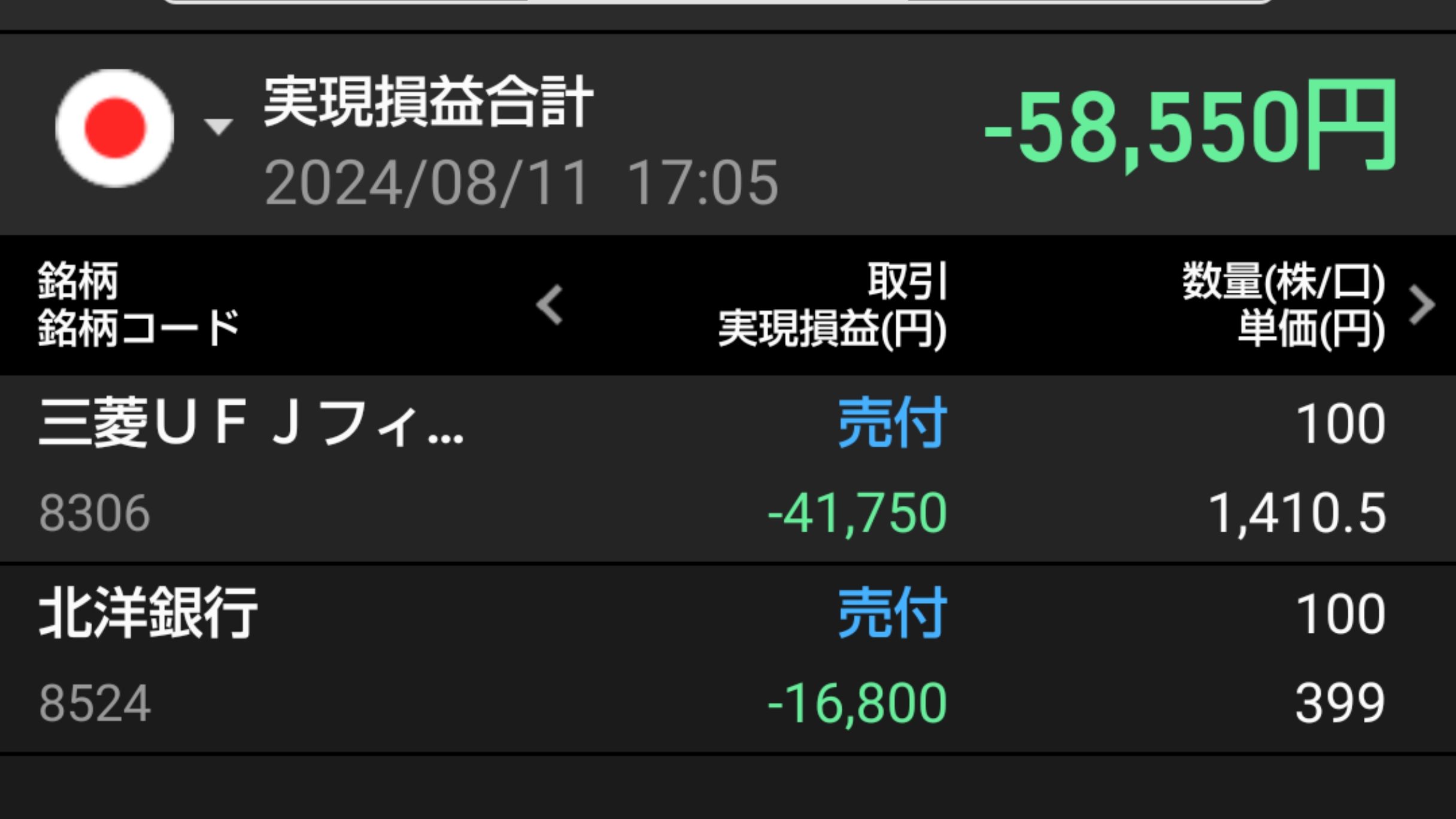![]() おはようございます☆ 8月配当銘柄にINしたくて… 資金確保の為… 結局、2銘柄損切り。 ![]() どちらも7月上旬にINしたのですが… INしたタイミングが悪かった(;´Д`) INした翌日からぐんぐん下げだし… デイ資金枯渇_| ̄|○ さらに直撃した8月の大暴落。 アイタタターーー( ゚д゚ ) 三菱UFJはNISA枠でも1単元もってて、かろうじてプラス。 そっちの利確も考えましたが… 翌月に控える配当。 特定残したら、配当金の税金取られてモッタイナイ。 ということで… 特定三菱バイちゃ~(ヽ´ω`) 北洋は大量買いしてしもうたので、一部利確です。 残した1600株ちゃん、頑張りんしゃい!! さっ、この損切り&INは吉と出るでしょうか!? にほんブログ村 お気に入りの記事を「いいね!」で応援しよう