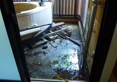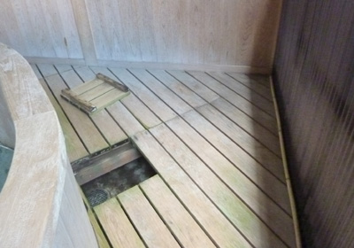 ここで思いっきり引っ張りたかったところですが、12月も忙しく更新がいつのことになるやら分かりませんので・・・ 「裏からビスを打つのは無理です。」 って今更恰好が悪い話ですが、泣きつきました。 できる限りビスの本数を減らすことで、上からビスを打つことを了承してもらい、時間もあと1時間だけ延長をさせてもらって最低限今日お風呂に入ることができる程度まで作業をすることにしました。 8月9日(延長戦1日目)午前9時半。 まだお客様が部屋に残っていました。 お風呂でタバコを吸われていましたのでしばらく待機。 午前10時作業開始。 昨日仮止めしかしていないので、一通りビスを打ちまししたり、細かな場所の修正をしたりして午後3時作業完了。 桧の浴槽にビリアン(ウリン)の床。 これも中々いいでしょ!! 秋には別の部屋もウリン風呂に改装しました。 今日も新たなお客様がウリンのお風呂に気持ちよく浸かっているんでしょうね。!!-----------------------------------------------------ウッドデッキ工事(香川県、高松市)の施工のご依頼はウッドデッキネットへPS 先週今週はD君の言葉を借りるとロケットスタート連発!!19(月) 兵庫県西宮市でウッドデッキ工事開始21(水) 和歌山県紀の川市(いつもの駅の日)23(金) 高知県馬路村でウッドデッキ工事開始24(土) 兵庫県西宮市途中経過確認29(木) 高知県馬路村工事完了・残材引き上げ1(土) 兵庫県西宮市工事完了・残材引き上げ 別件の西宮市の工事の打ち合わせ12月3日より20日頃まで香川県内6件の工事こんな感じで、年末まで事務所に座っていられたのは、今週だけだったのです。さあって明日からのラストスパート がんばるぞーー!!