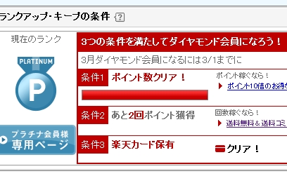 うおおおおおおおおお、なんなんだ、この歯がゆさ・・・!!なんとなく、久しぶりにポイントクラブのページを開いて見たら、あと2回ポイント獲得で、プラチナ会員からダイヤモンド会員になれるっぽいです。というか、ダイヤモンド会員なんてあったっけ?(´・ω・`)よく分からないけど、せっかくだからランクアップしたいぞ!今、欲しい物は特に無いので(本当はあるけどポイントが少ない)、買い物以外で何をすれば楽天ポイントが貯まるのか、よく分からず楽天のページをフラフラ彷徨ってます。とりあえずクジは全部ハズレました。わはーこのまま、アタフタしながら今月をフィニッシュしそうな予感。・・・・・追記(2月28日)楽天銀行に振込来たらポイント付きました。分かりづらいっっ