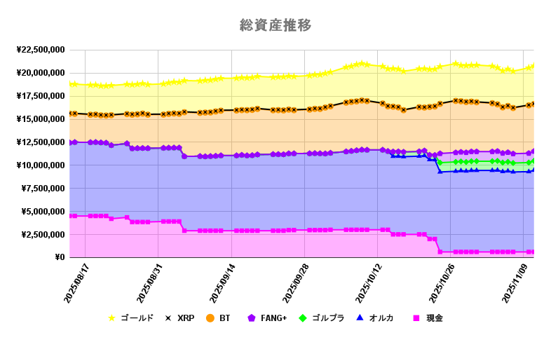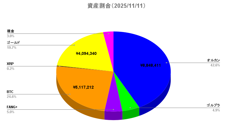 | オルカン評価額 | 8,848,411円 | | ゴルプラ評価額 | 1,026,764円 | | FANG+評価額 | 1,040,057円 | | BTC評価額 | 5,117,212円 | | XRP評価額 | 41,632円 | | ゴールド評価額 | 4,094,340円 | | 現金(生活防衛資金除く) | 613,742円 | | └ うち新規入金 | 0円 | | └ うち新規支出(投資) | 0円 | | └ うち新規引出(緊急時のみ) | 0円 | | 総資産額 | 20,782,157円 |