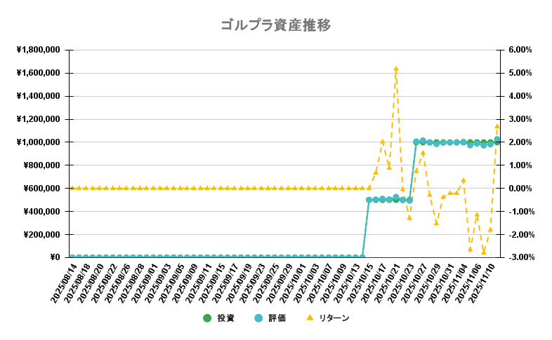 | 投資額(本日分) | 0円 | | 投資額(累計) | 0円 | | 取得量(本日分) | 0g | | 取得量(累計) | 200g | | 現在価格(17:00時点) | 20,472円/g | | 評価額 | 4,094,340円 | | 評価損益 | +4,094,340円 | | リターン | ー |