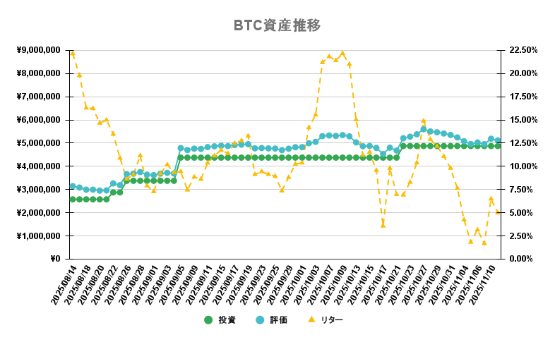 | 投資額(本日分) | 0円 | | 投資額(累計) | 4,874,245円 | | 取得数(本日分) | 0BTC | | 取得数(累計) | 0.31624135BTC | | 現在価格(17:00時点) | 16,181,350円/BTC | | 評価額 | 5,117,212円 | | 評価損益 | +242,967円 | | リターン | 4.98% |