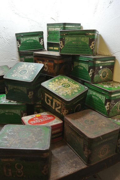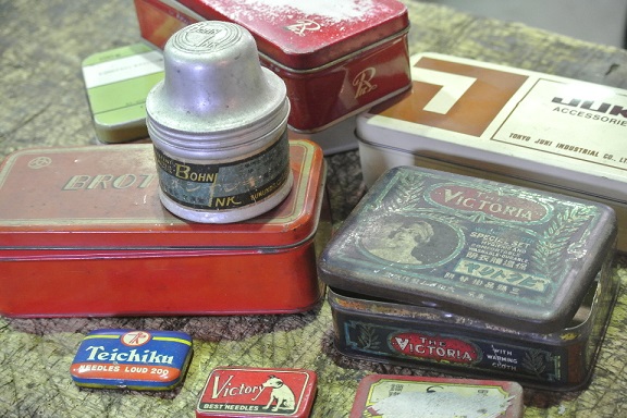 古いミシンに付いていた缶、蓄音機針のケースなど、どれも味わいがあります。