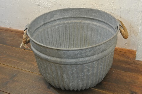 アメリカ製のバケツ入荷 、直径44cmの分厚いブリキで作られてます、取っ手は縄で可愛いです、ガーデニング、イベントの什器などなどいろんな物に使えます、残り1つになりました。 SOLD OUT