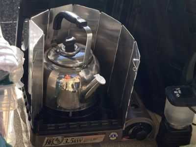 気温が低くなり、一般カセットコンロだと冷却されて効率が悪いそろそろ白ガスの出番かな
