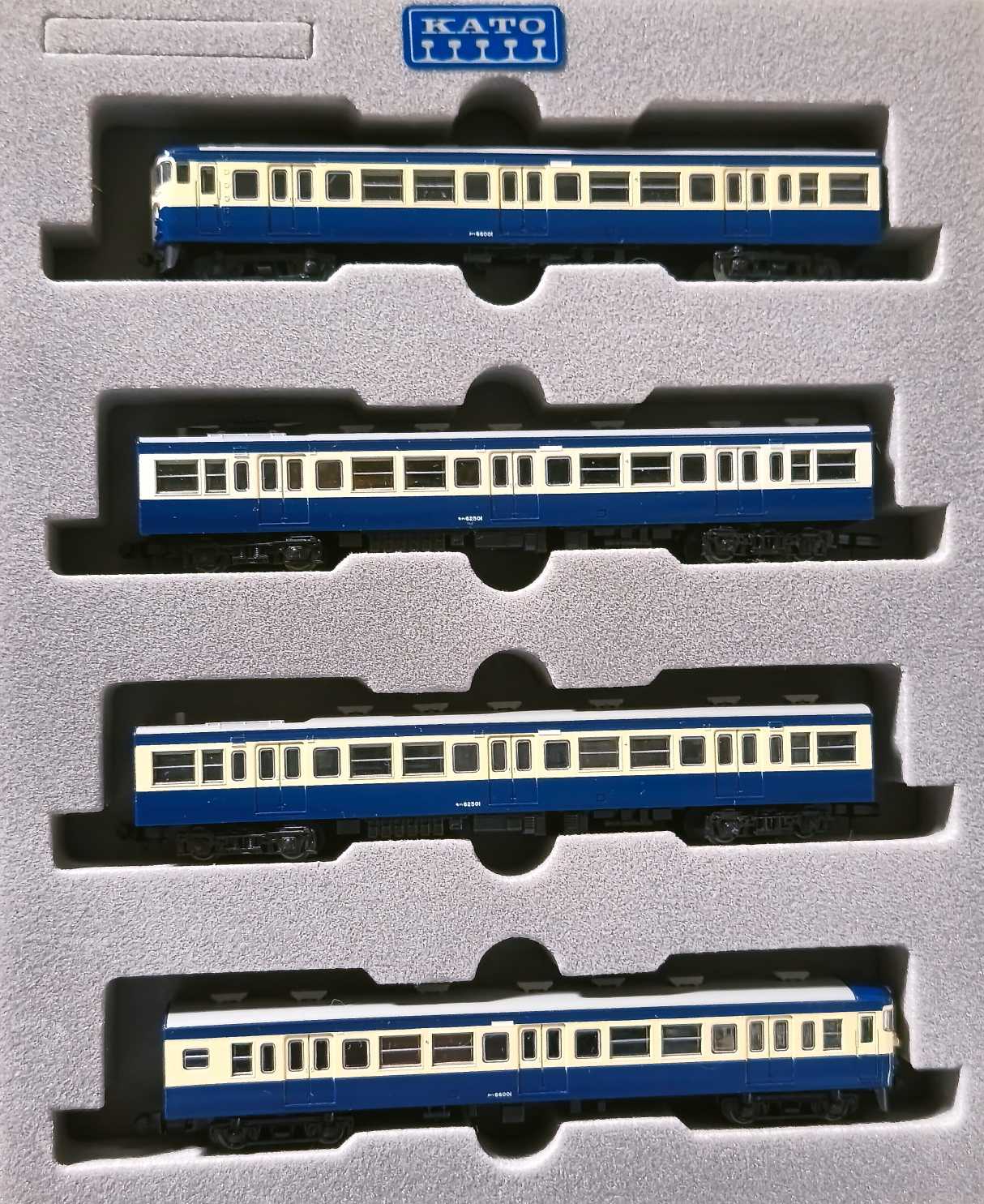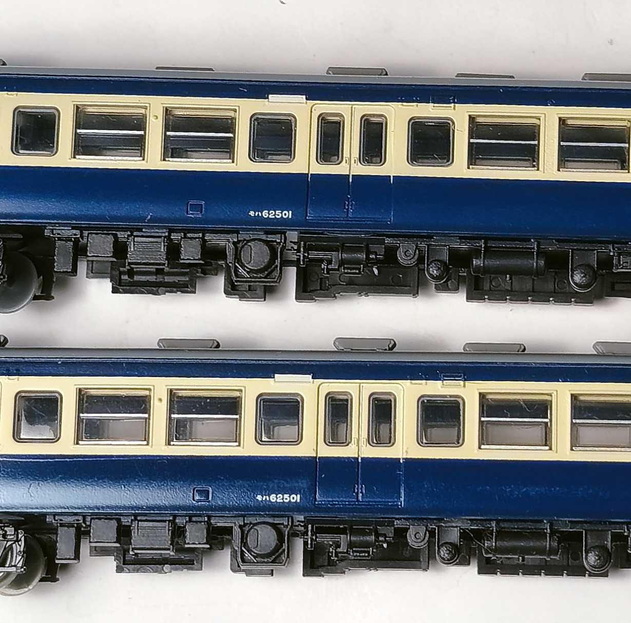 先日、鉄コレの62系を2両、リサイクルショップにて発見して購入しました。 低屋根仕様なので、モハ72に倣って850番台にすることもできたと、今になって思うのです。 ![]() 番号部分です。 窓はユニットサッシ。 ![]() モハ62のサイドビュー。 ![]() 番号。 ![]() パンタ部分。低屋根の造りが見えます。 [鉄道模型]グリーンマックス (Nゲージ) 5802 PS13N パンタグラフ 2個入 [鉄道模型]グリーンマックス (Nゲージ) 5811 PS13G パンタグラフ 2個入 ![]() このような4両が組めるようになりました。製品写真ふうに撮っておきました。 ![]() 元から所有していた車両と比べてみます。 ![]() 左が先に所有していたクハ。右の最近購入のクハとはクリームの色味が異なります。 ![]() 元から所有していたクハは、前面と側面でクリーム色が異なっています。 鉄コレなので、そういうものかと軽く考えていました。 他形式のスカ色も同じように色が違うので。 ![]() 関連記事:KATO 115系 横須賀色 【中古】Nゲージ KATO(カトー) 10-452 115系1000番台 横須賀色 4両セット 【A´】 背表紙文字書き込み / スリーブ若干傷み 【中古】004 KATO 115系(横須賀色)x4両 永大キロハ28(T)+TOMIX キロ28(旧)+KATO キハ58(旧)点灯無 7両セット[19] ![]() (関連記事:113系 横須賀色 KATO&TOMIX) 【中古】Nゲージ TOMIX(トミックス) 97923 JR 113-2000系 近郊電車 (横須賀色・幕張車両センター114編成) 4両セット 【B】 ※パーツ取付残無 ※ウレタンスペーサーなし ※スリーブ若干傷み TOMIX Nゲージ 特別企画品 113-2000系 横須賀色・幕張車両センター114編成 セット 4両 97923 鉄道模型 電車 ![]() クハの番号は2両とも、クハ66001。 ![]() クハ2両の床下です。違いはなさそう、というか、全く同じもの。 ![]() モハも番号は2両とも同じ。モハ62501。 ![]() 下が前より所有してた模型。 車端部分の色が違っています。何故に違うのかは不明。 ![]() モハを2両繋げて、比べてみます。 ![]() 右のモハのほうが、クリームの色は明るめ。 ![]() 前面です。 ![]() とりあえずKATO4両用ブックケースに収めておきます。 【中古】Nゲージ TOMIX(トミックス) 98931 国鉄 115-2000系近郊電車 (身延線) 4両セット 【A】 ――――― お気に入りの記事を「いいね!」で応援しよう