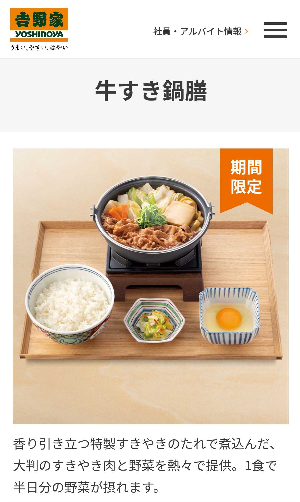 今回は「牛すき鍋膳」。 ![]() 牛肉のほか、お野菜もけっこう入っています。 公式HPの案内では、 ![]() ほうほう、半日分のお野菜とな。 ![]() HPと比べると鍋の盛りつけが雑に見えますが、まぁ広告なんて、無理にでも綺麗に見せるもの。 具材は広告と、当たり前ですが同じでした。 昨年、吉野家で食べた「牛肉玉ラーメン鍋膳」がなかなかよかったので、本当はこちらを食べたかったのですが、販売期間終了していました。 ![]() (関連記事:吉野家の牛肉玉ラーメン鍋膳) 右上にチラリ見える花椒が美味かったんです。 もう鍋を食す気でいたので、今回は「すき鍋膳」に初挑戦。 ![]() おひとり様鍋、肉はたくさんあるように見えますが、実際はそうでもありませんでした。 お味のほうは、まさに関東風すきやき。甘いです。吉野家牛肉のあの匂いが、ほぼ感じられず。。。 \4,408円OFF! 2/10 1:59まで!/吉野家 公式【送料込み】 牛丼・牛鍋丼の具24袋セット(牛丼 /牛鍋丼/ 各12袋) 仕送り 買い置き 時短 グルメ 冷凍食品 ストック 時短 簡単 ギフト ![]() 中からはうどん?きしめん?が出てきました。 【ふるさと納税】吉野家 非常用缶飯6缶詰合(4種類) | ![]() 鍋膳はごはんおかわり自由なので、つい2杯目も。 おかわりは別料金になりますが、すき家の鍋のほうが辛くて自分の好みかも。 ![]() (関連記事:すき家の牛・旨辛豆腐鍋定食) 気温が低いときはコチラかな。 【期間限定】【送料無料】牛丼の具 32パックセット すき家 急速冷凍 ―――――― お気に入りの記事を「いいね!」で応援しよう